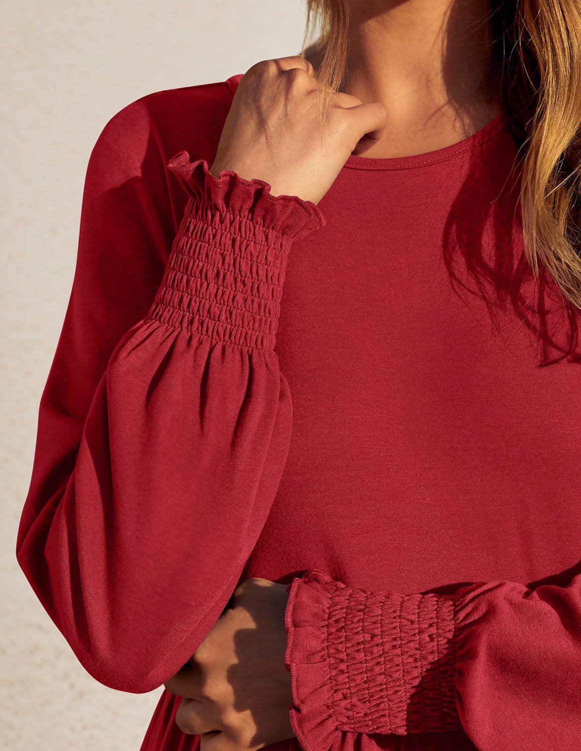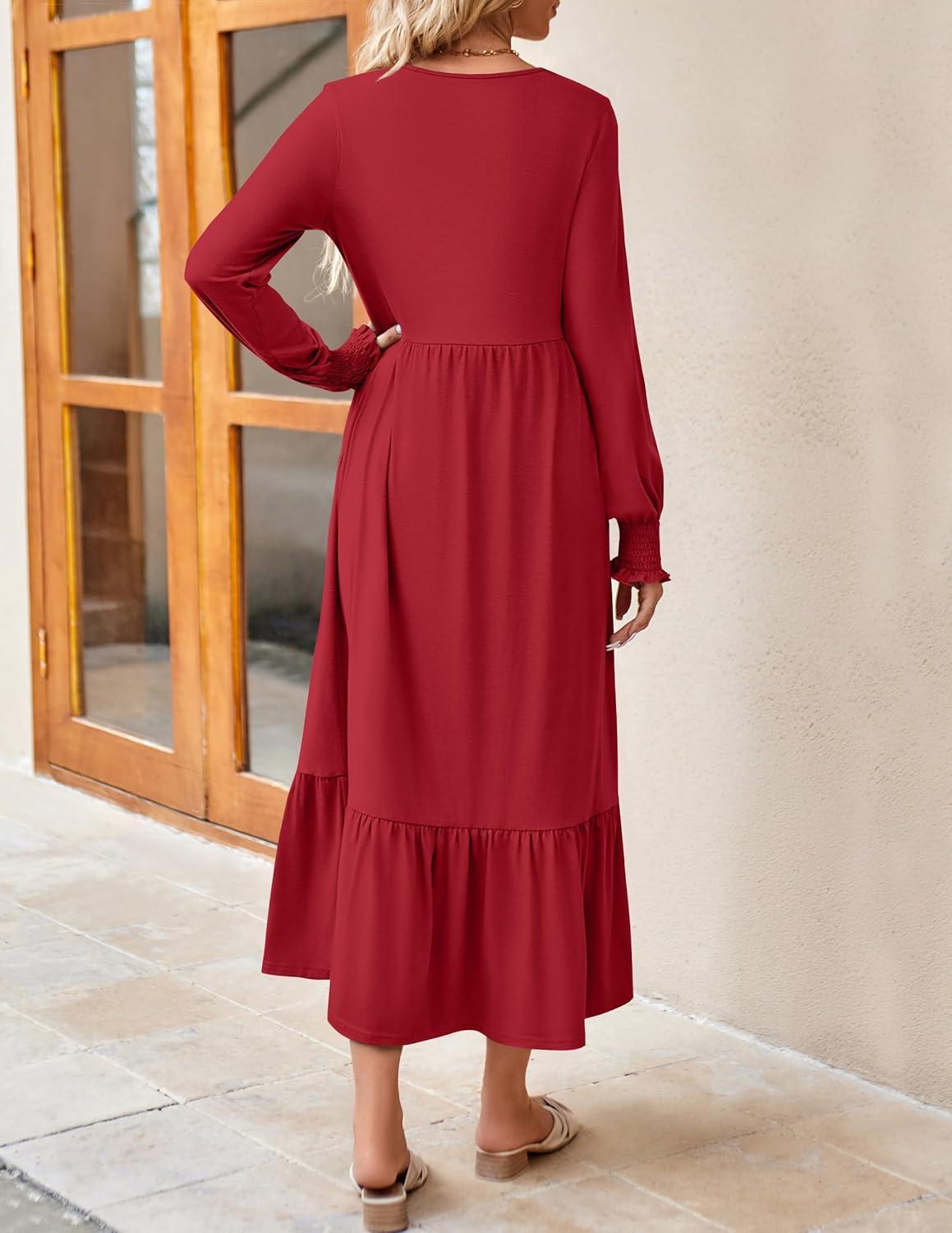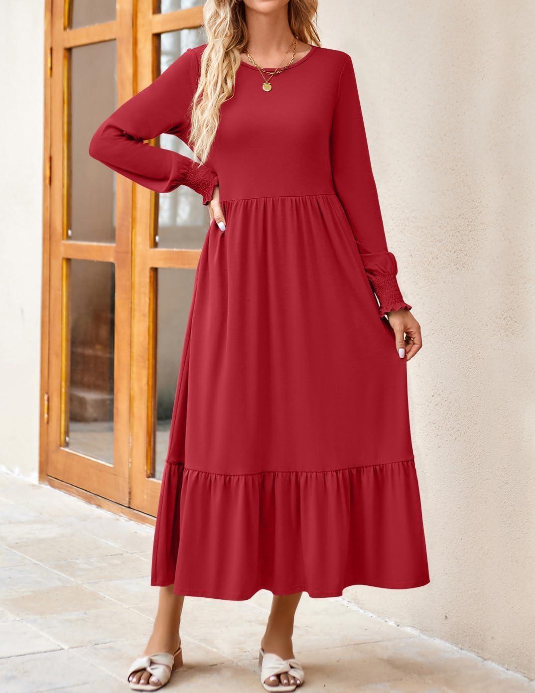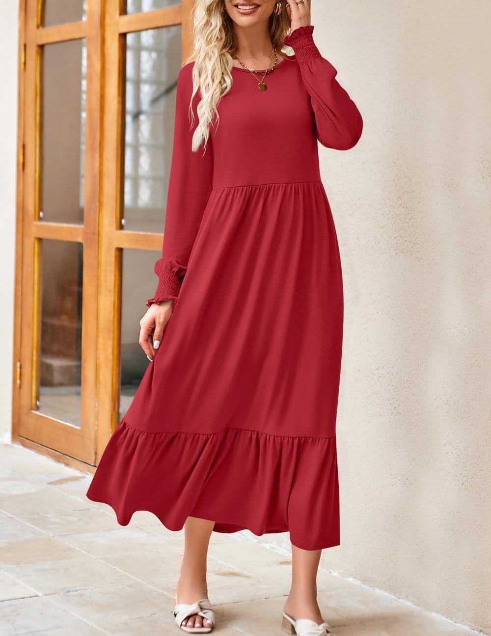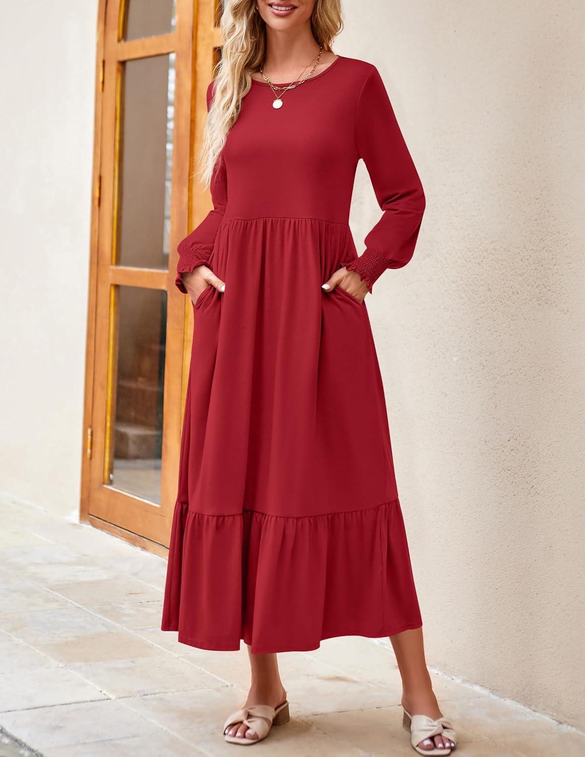 ZESICA Women’s 2025 Fall Long Sleeve Dress Crewneck Casual Loose Pleated Tiered Swing Midi Dresses with Pockets(Red)