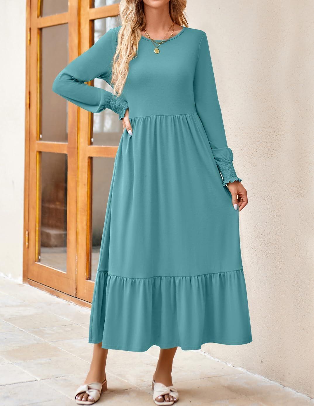 ZESICA Women’s 2025 Fall Long Sleeve Dress Crewneck Casual Loose Pleated Tiered Swing Midi Dresses with Pockets(Darkgrey)