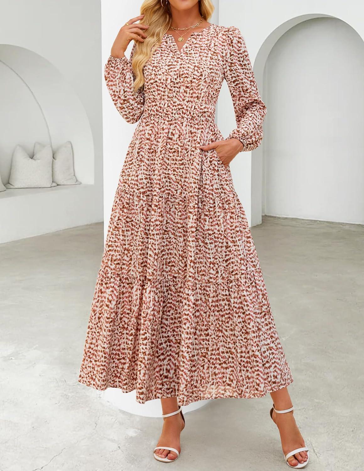 ZESICA Women’s 2025 Fall Long Sleeve Maxi Dress Floral Print V Neck Empire Waist A Line Tiered Flowy Boho Party Dresses(Orange Red)