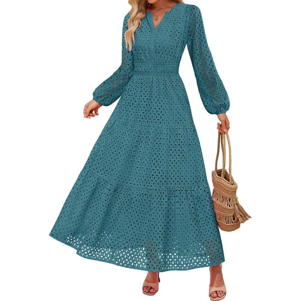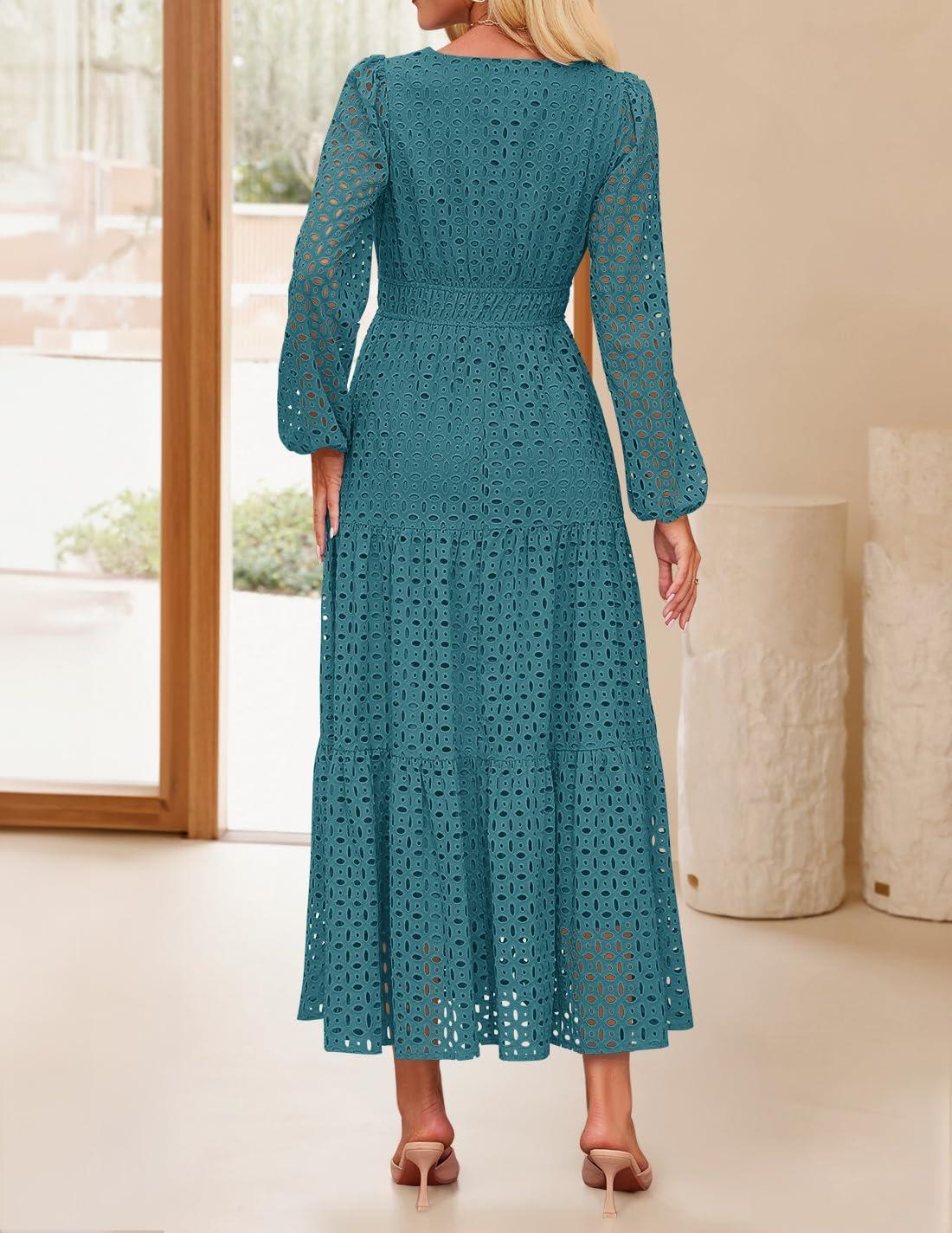 ZESICA Women’s 2025 Fall Long Sleeve Maxi Dress V Neck Hollow Out Eyelet A Line Long Flowy Casual Party Dresses(Teal)