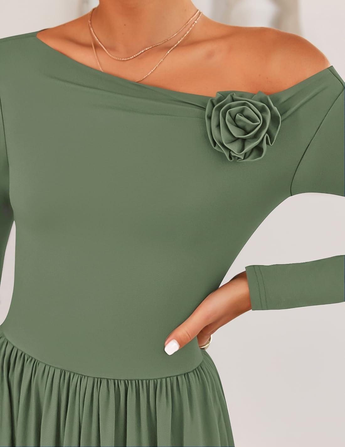 ZESICA Women’s 2025 Fall Long Sleeve Off Shoulder Maxi Dress Pleated Elegant Formal Wedding Guest Dresses with Pockets(Beangreen)