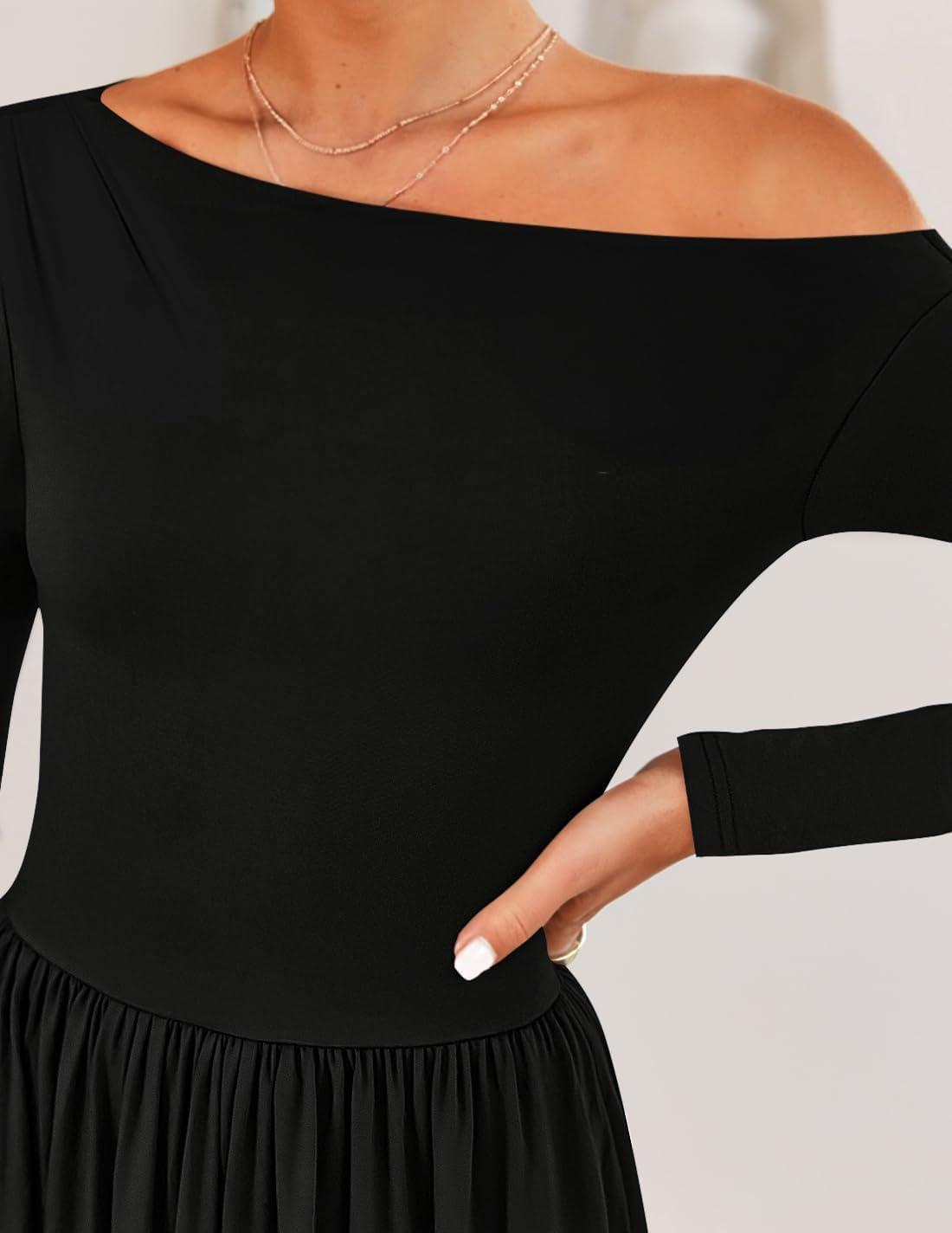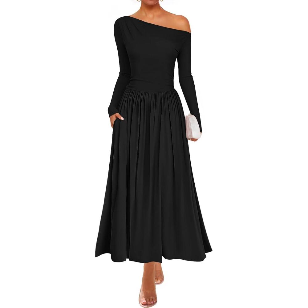 ZESICA Women’s 2025 Fall Long Sleeve Off Shoulder Maxi Dress Pleated Elegant Formal Wedding Guest Dresses with Pockets(Ebony)