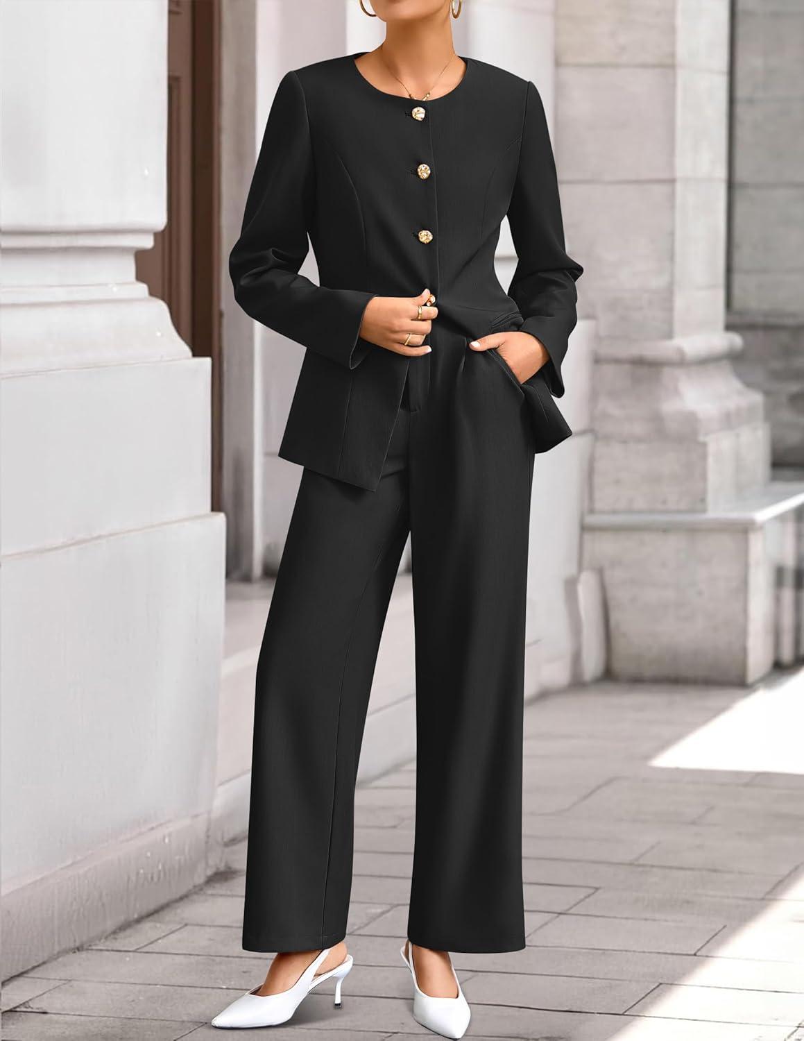 ZESICA Women's 2025 Fall Two Piece Suits Set Casual Business Long Sleeve Blazer Jacket Wide Leg Pants Work Outfits Sets(Black)