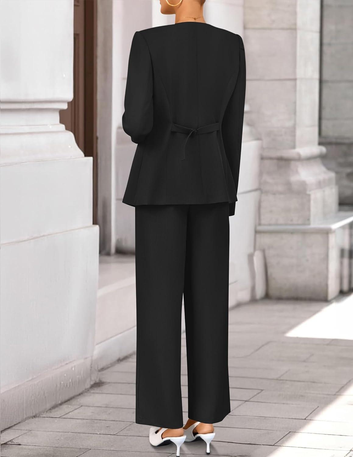 imageZESICA Womens 2025 Fall Two Piece Suits Set Casual Business Long Sleeve Blazer Jacket Wide Leg Pants Work Outfits SetsBlack