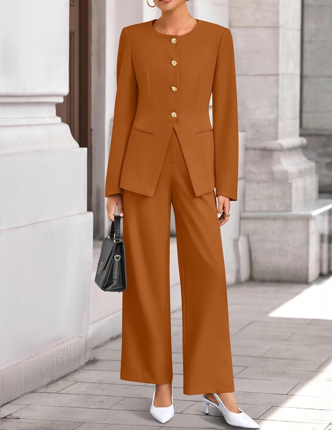 ZESICA Women’s 2025 Fall Two Piece Suits Set Casual Business Long Sleeve Blazer Jacket Wide Leg Pants Work Outfits Sets(Rust)