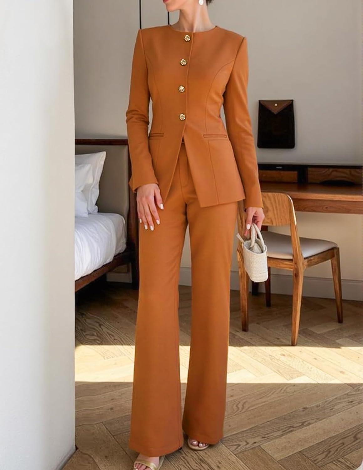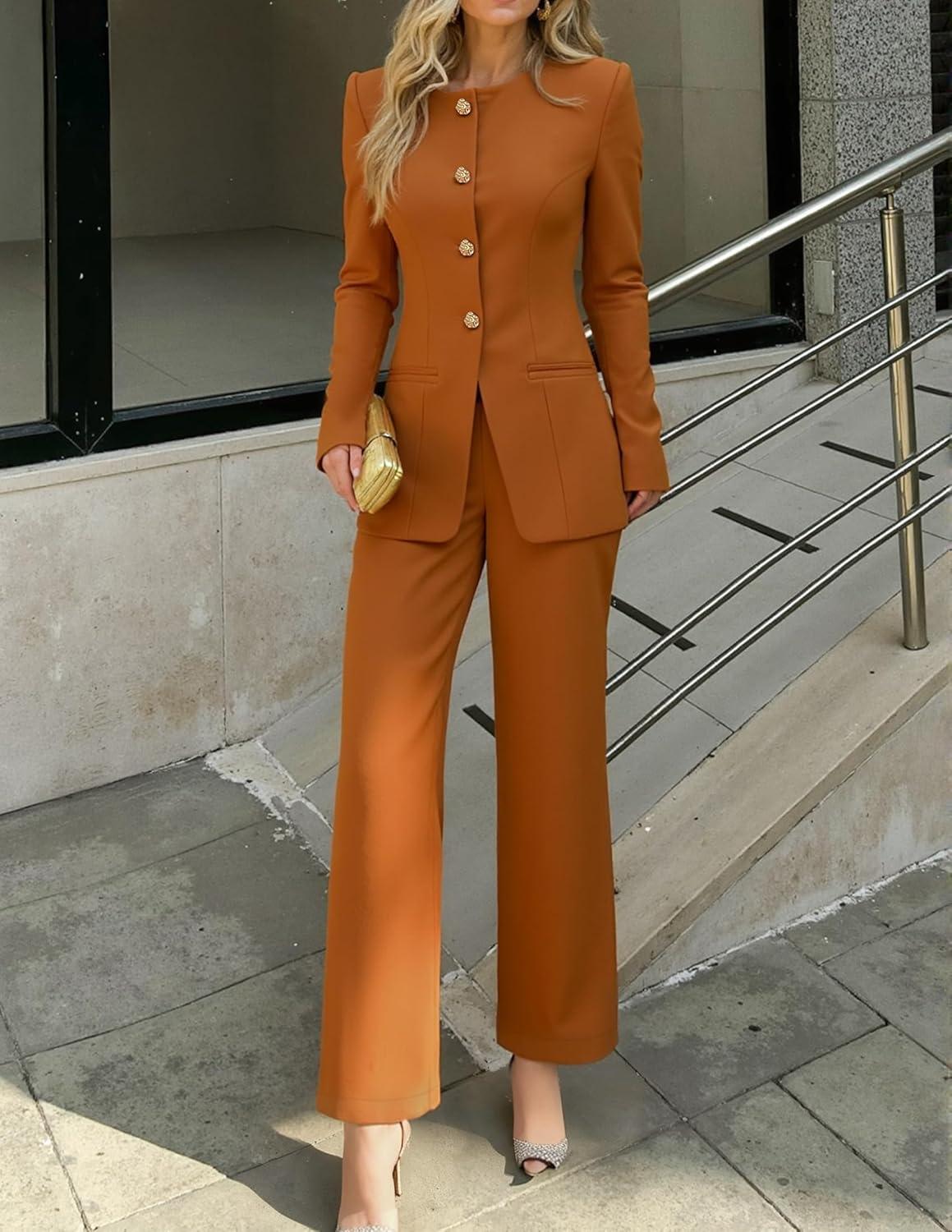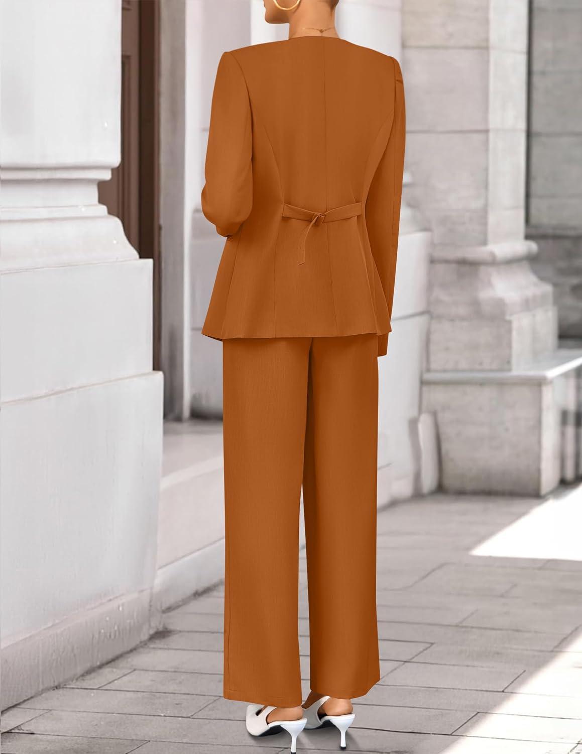 imageZESICA Womens 2025 Fall Two Piece Suits Set Casual Business Long Sleeve Blazer Jacket Wide Leg Pants Work Outfits SetsRust