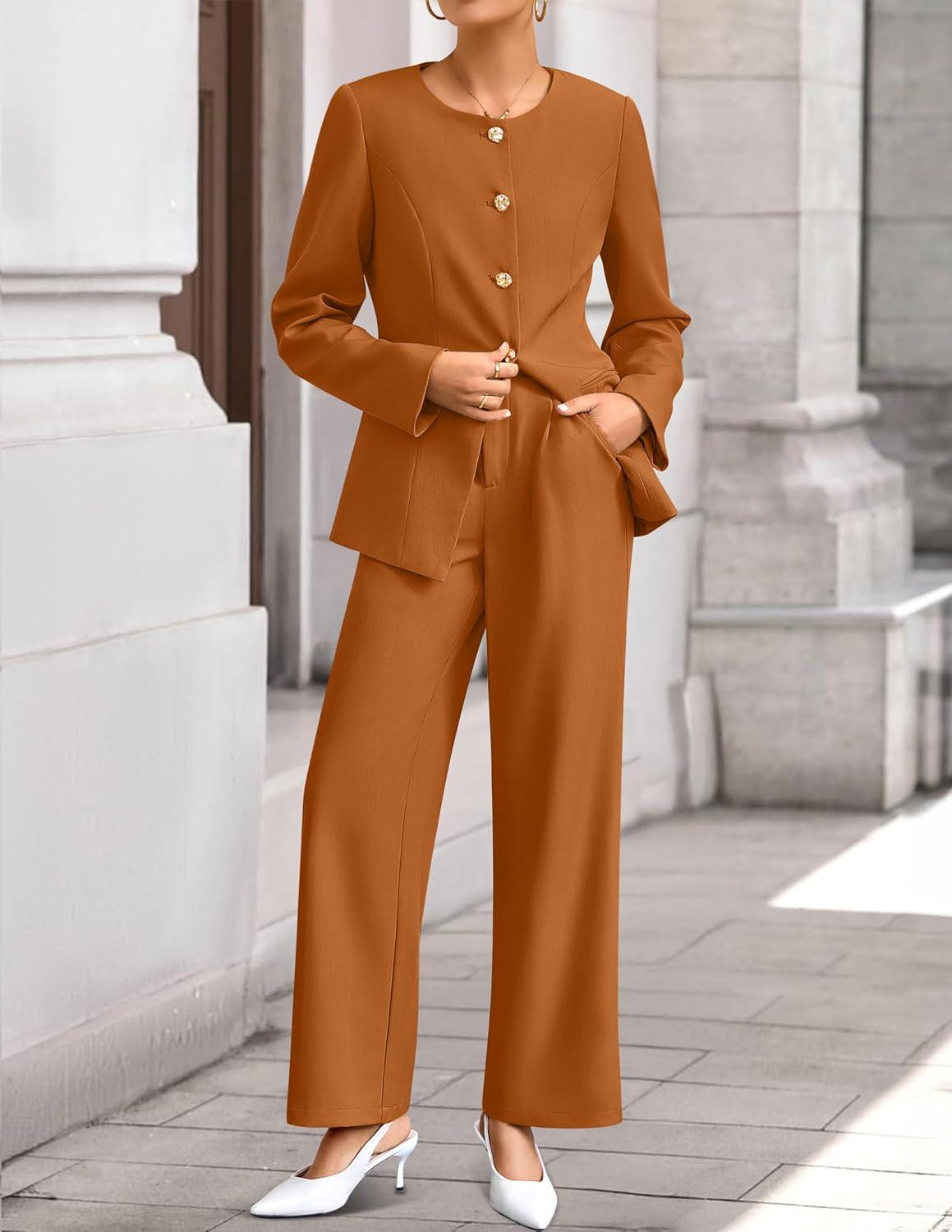 ZESICA Women's 2025 Fall Two Piece Suits Set Casual Business Long Sleeve Blazer Jacket Wide Leg Pants Work Outfits Sets(Rust)