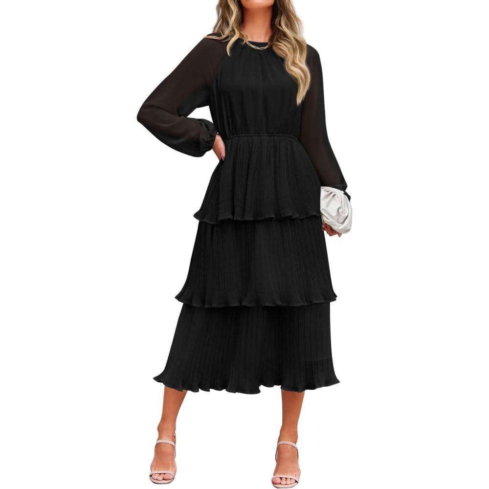 ZESICA Women's 2025 Long Sleeve Crew Neck Ruffle Tiered Layered Chiffon Flowy Swing Long Midi Dress(Black)