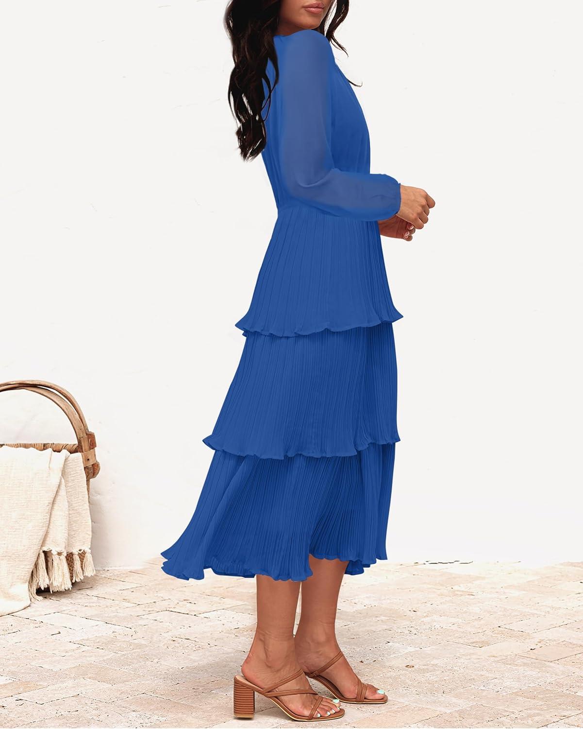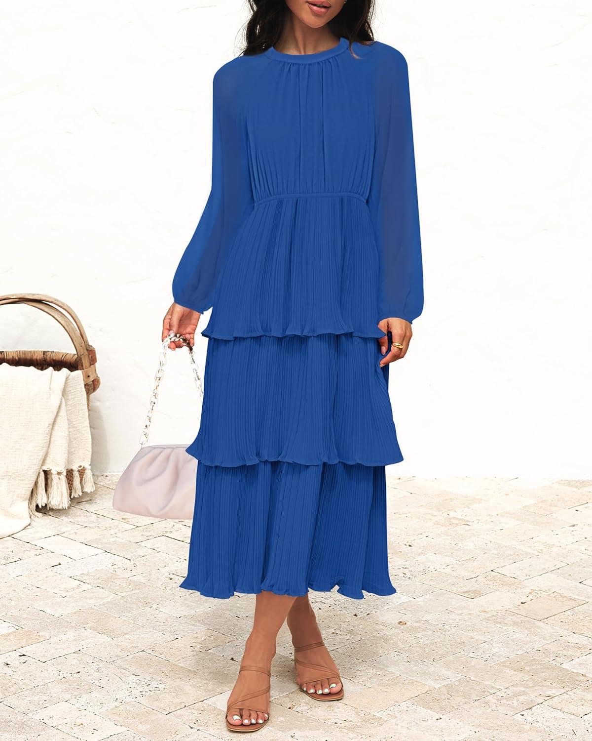 ZESICA Women’s 2025 Long Sleeve Crew Neck Ruffle Tiered Layered Chiffon Flowy Swing Long Midi Dress(Blue)