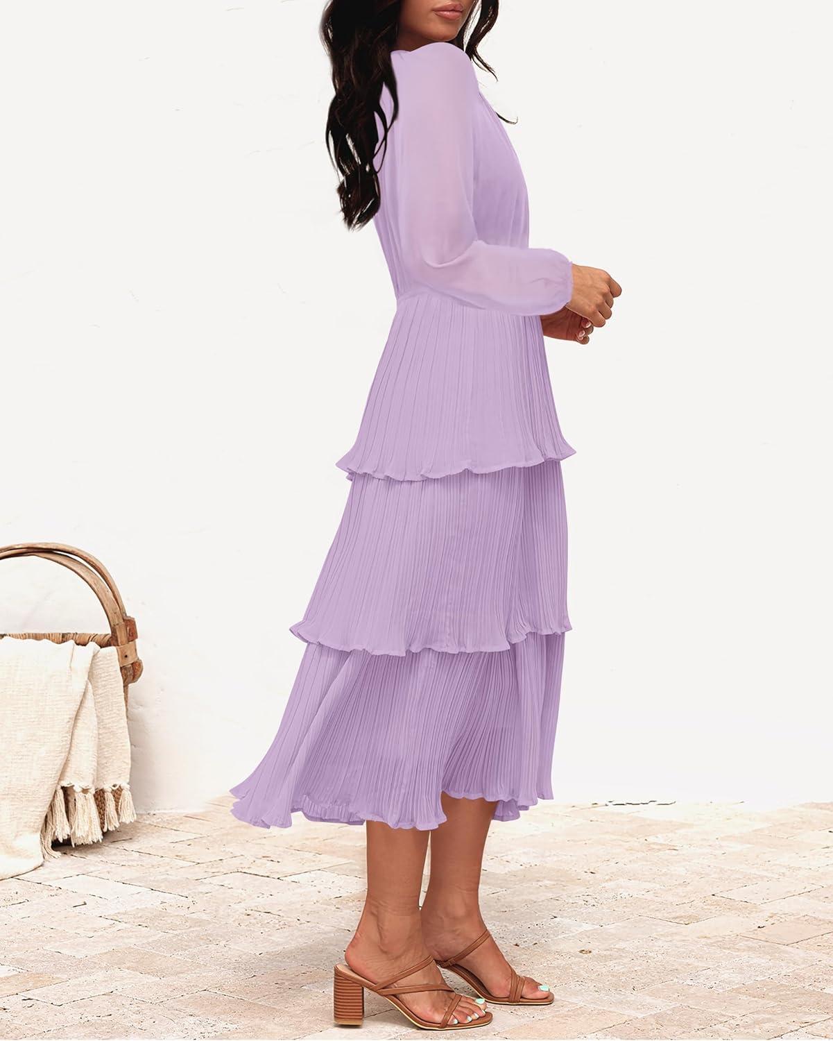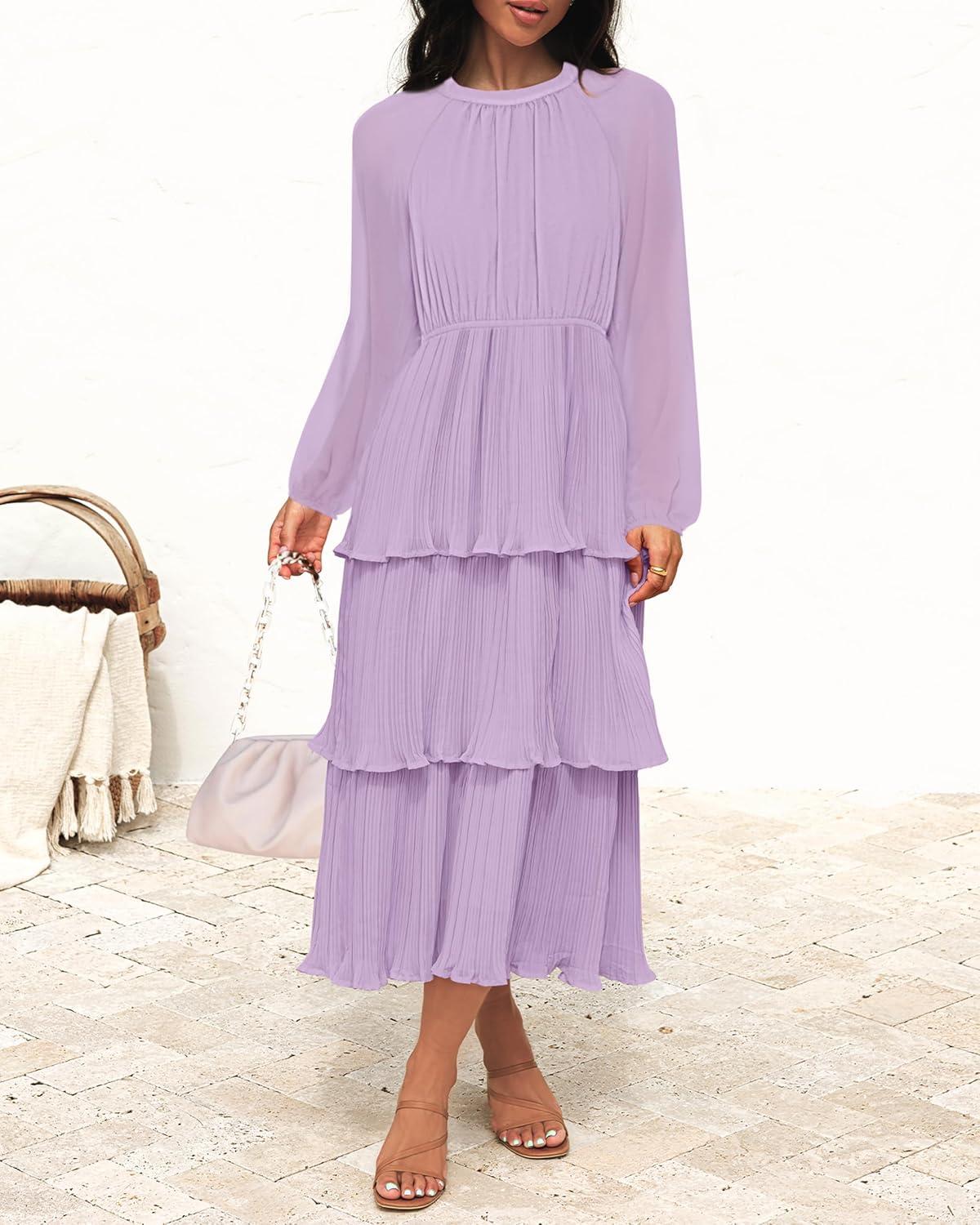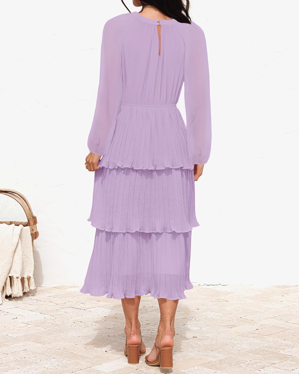 ZESICA Women’s 2025 Long Sleeve Crew Neck Ruffle Tiered Layered Chiffon Flowy Swing Long Midi Dress(Purple)