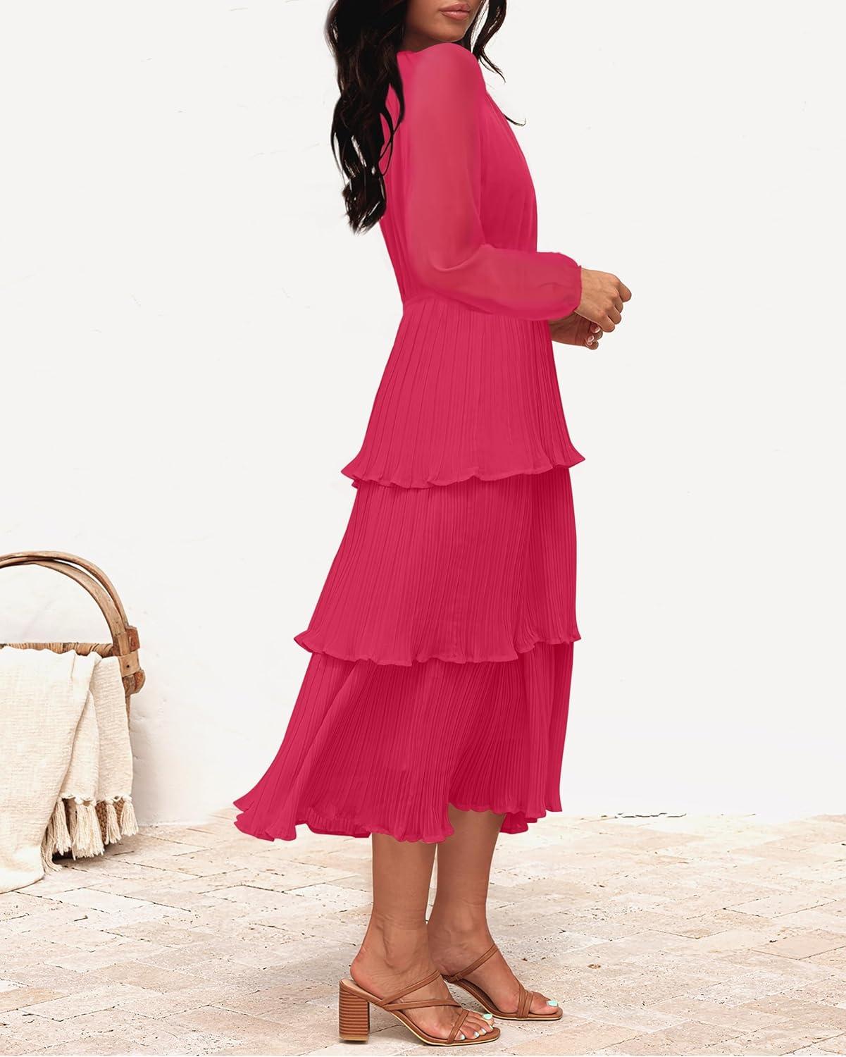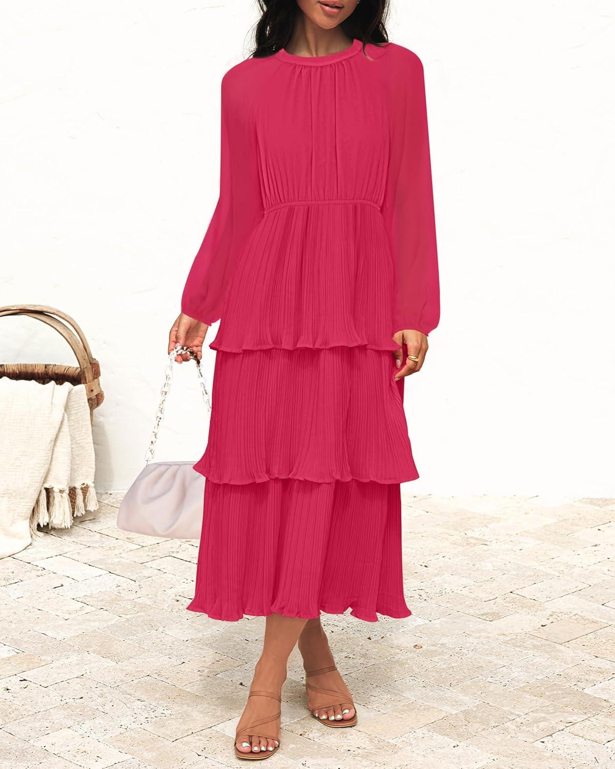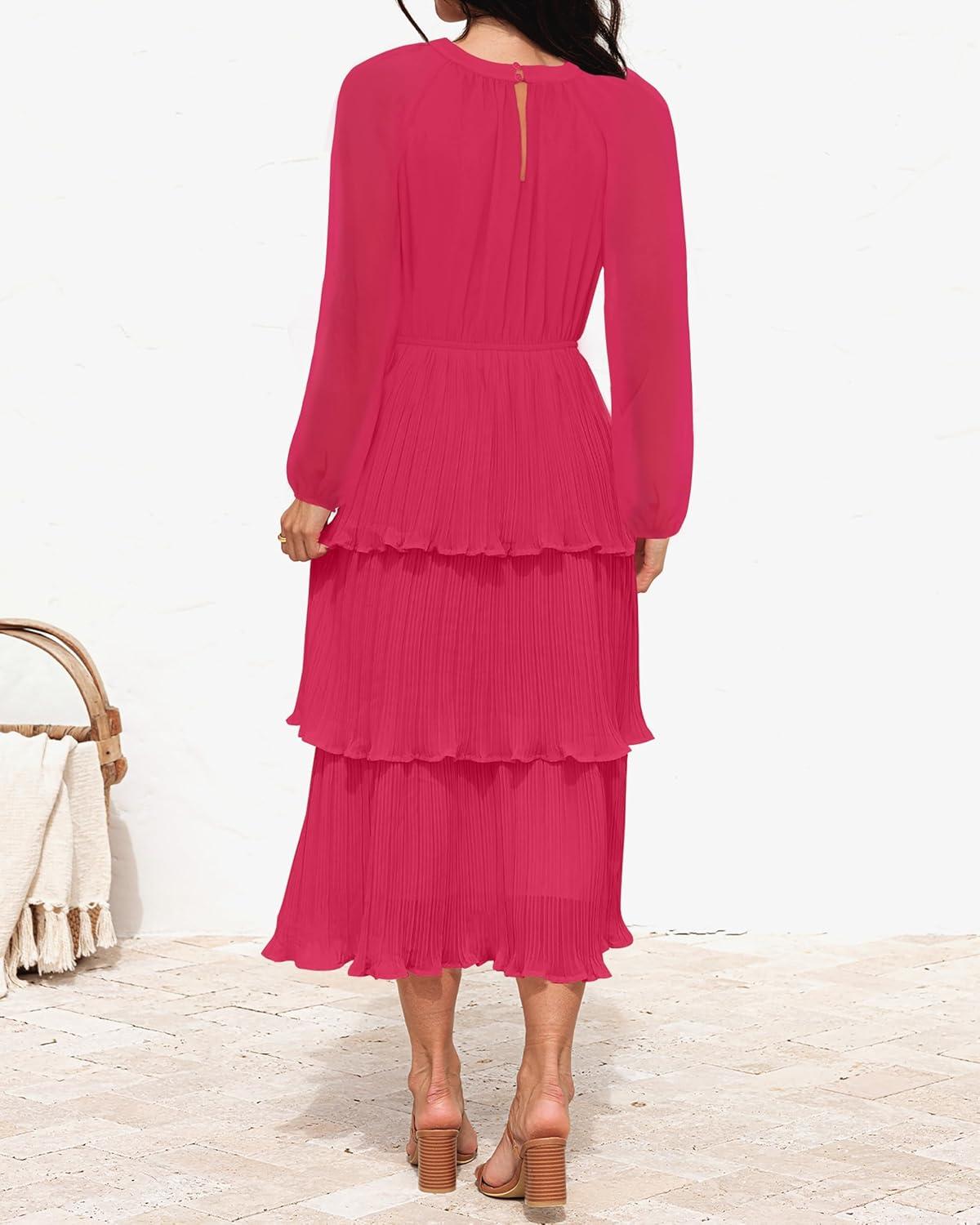 ZESICA Women’s 2025 Long Sleeve Crew Neck Ruffle Tiered Layered Chiffon Flowy Swing Long Midi Dress(Rose)