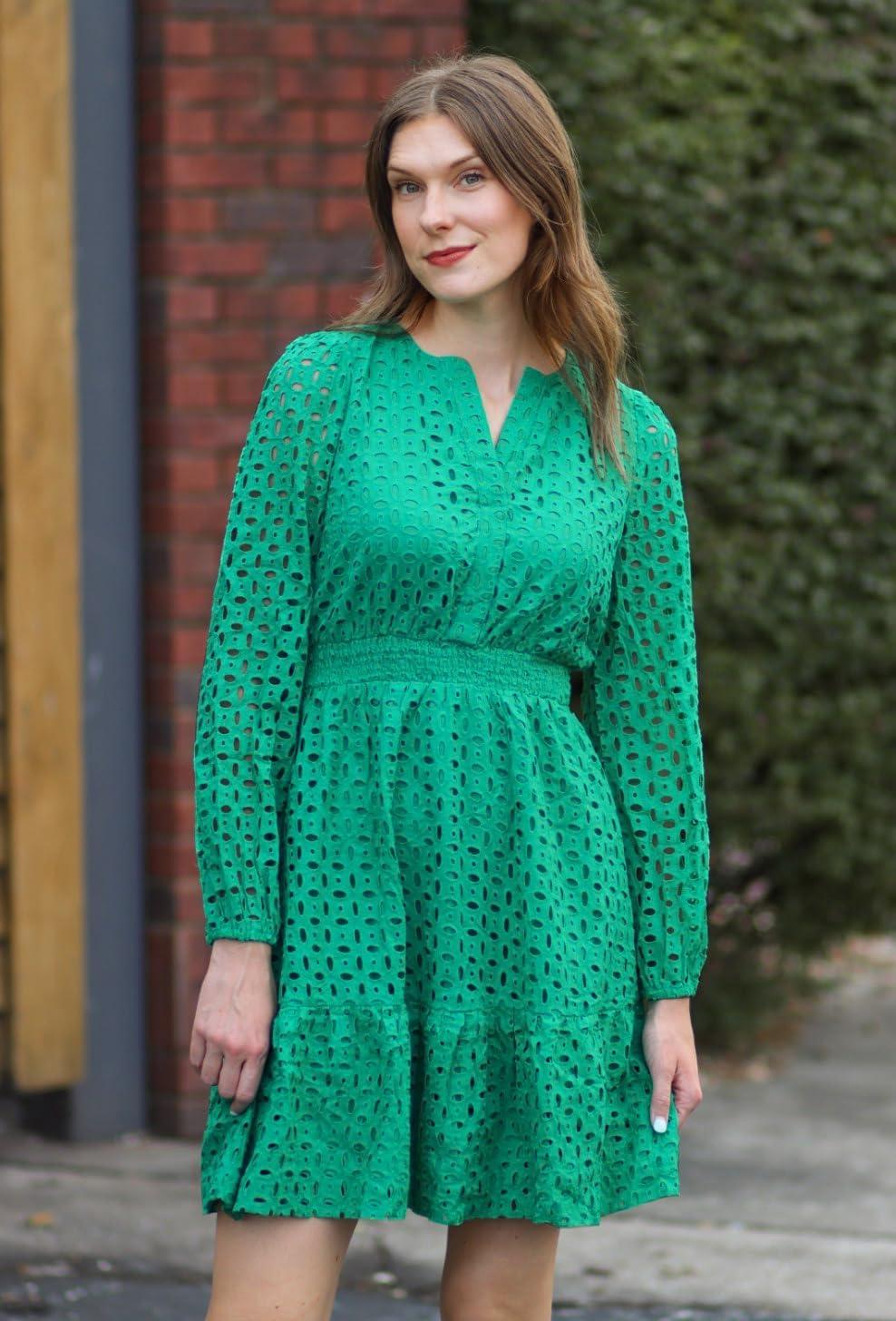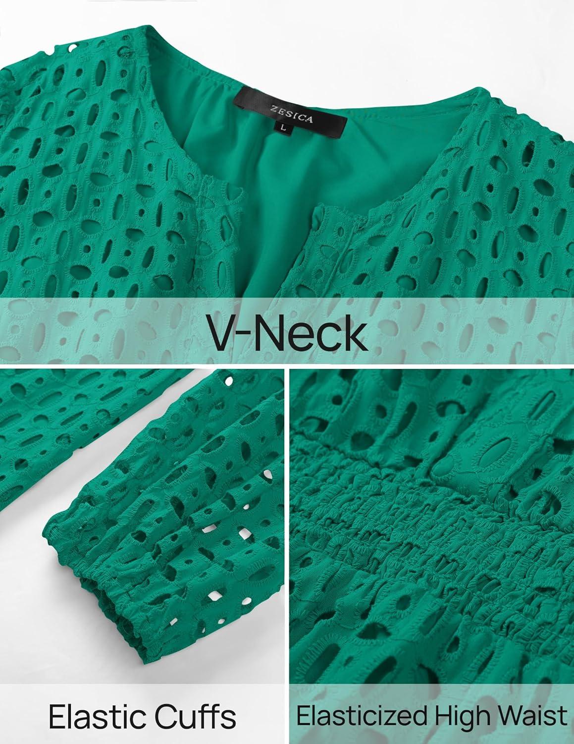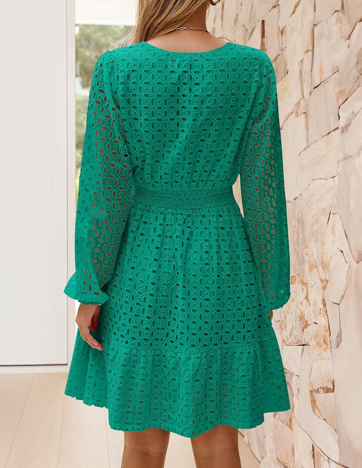 ZESICA Women’s 2025 Long Sleeve Mini Dress Fall V Neck Hollow Out Eyelet Embroidery Ruffle A Line Swing Short Dresses(Green)