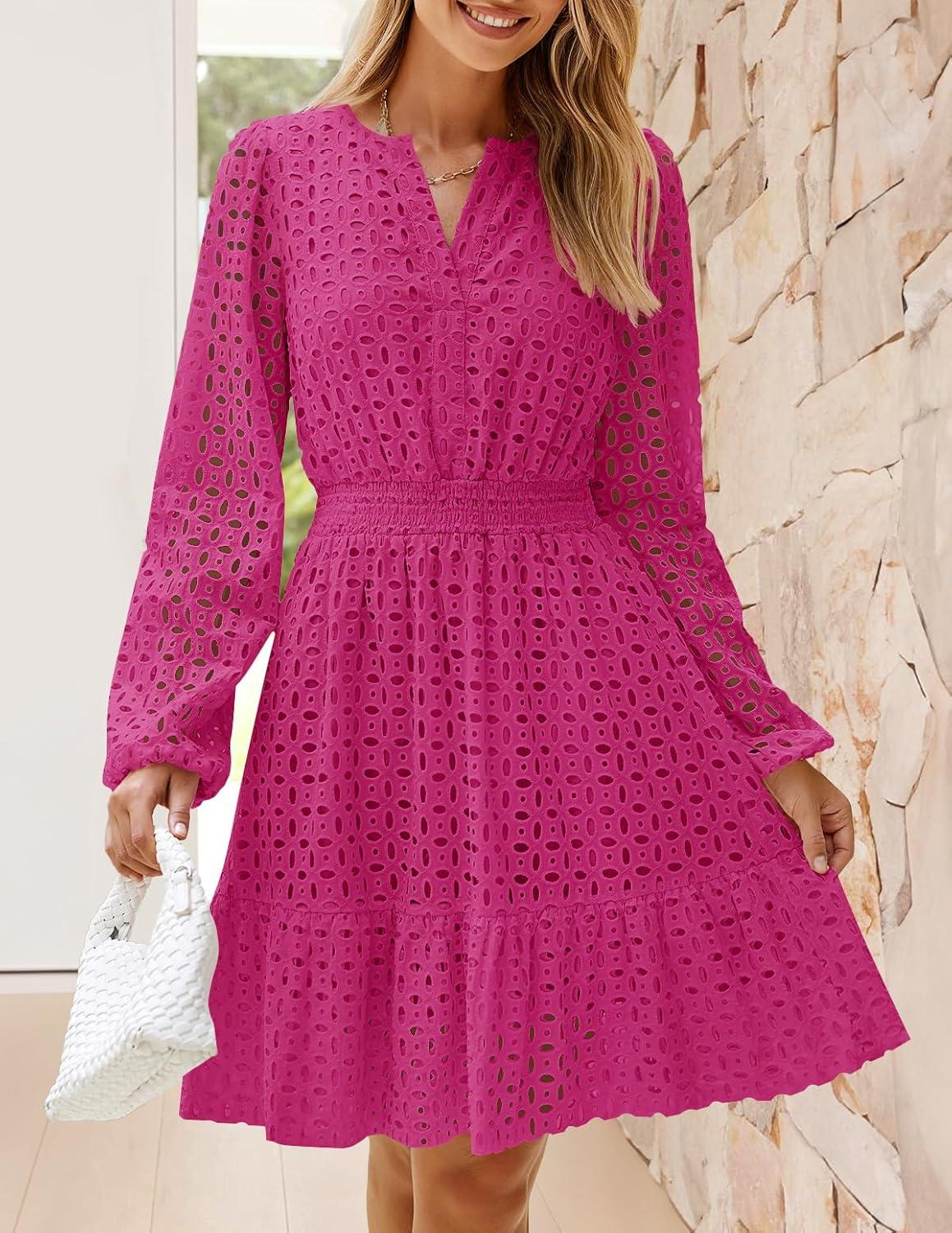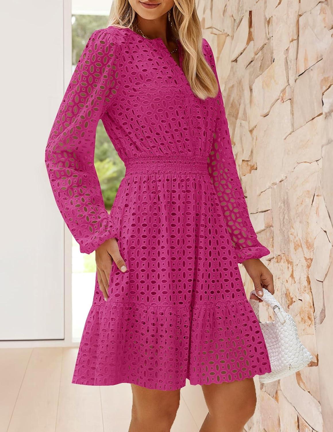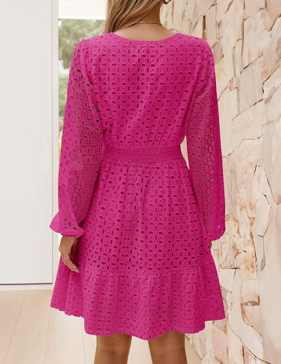 ZESICA Women's 2025 Long Sleeve Mini Dress Fall V Neck Hollow Out Eyelet Embroidery Ruffle A Line Swing Short Dresses(Rose)