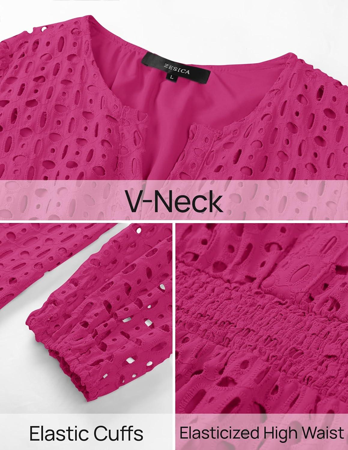 Get a free gift with your purchase of ZESICA Women’s 2025 Long Sleeve Mini Dress Fall V Neck Hollow Out Eyelet Embroidery Ruffle A Line Swing Short Dresses(Rose). Limited quantities available!