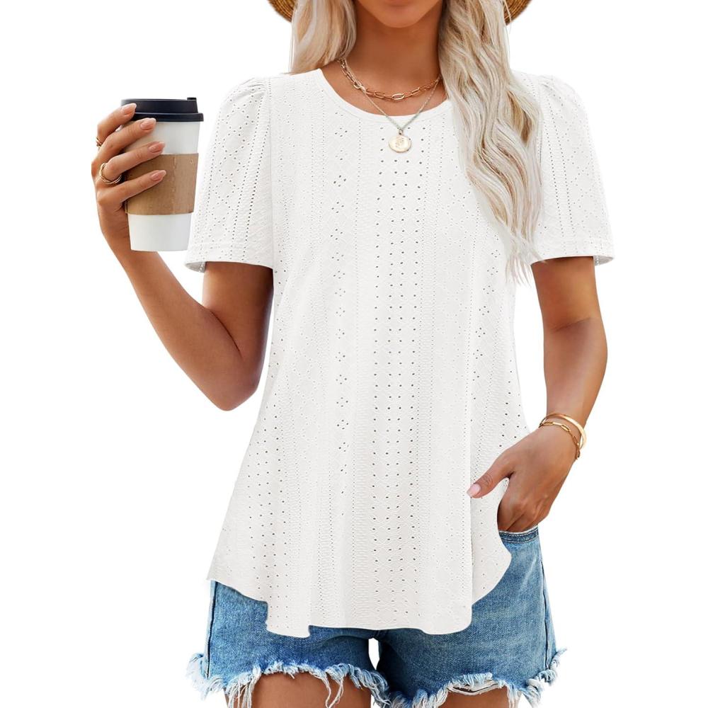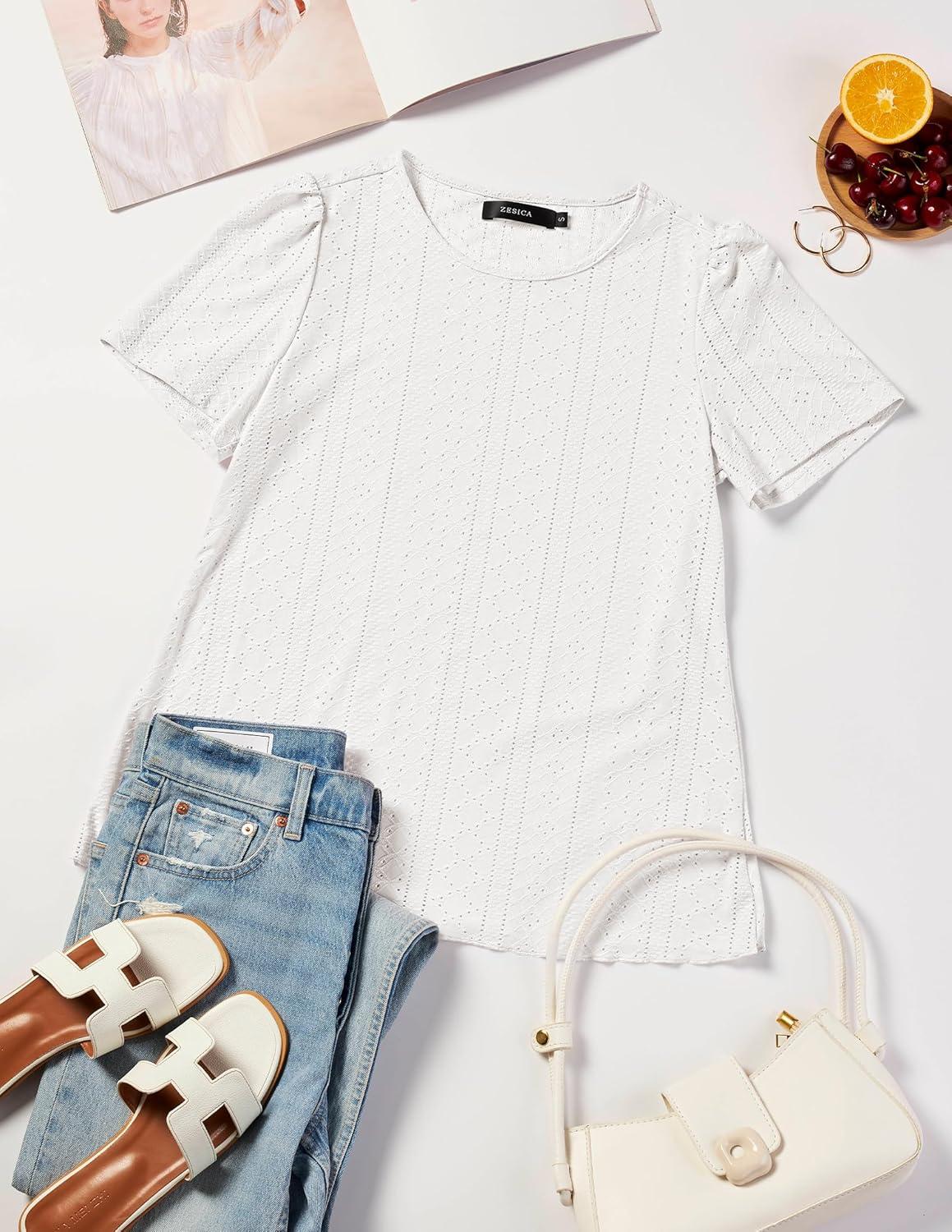 ZESICA Women’s 2025 Short Sleeve Eyelet T Shirts Crew Neck Flowy Loose fit Summer Basic Casual Blouses(White)