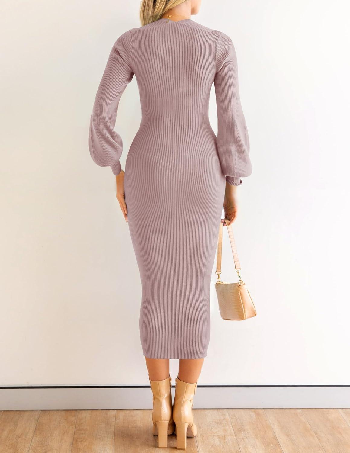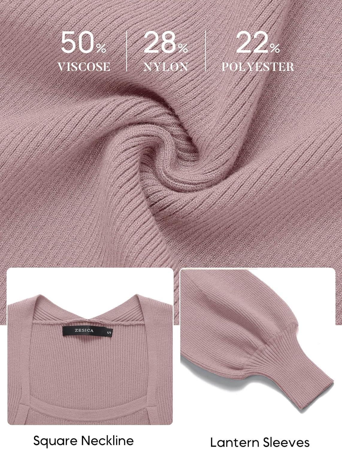 imageZESICA Womens 2025 Square Neck Ribbed Knit Dress Puff Long Sleeve Slim Fit Bodycon Fall Winter Pullover Sweater DressPurple