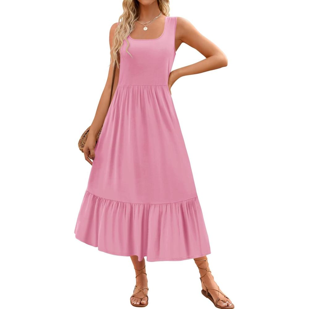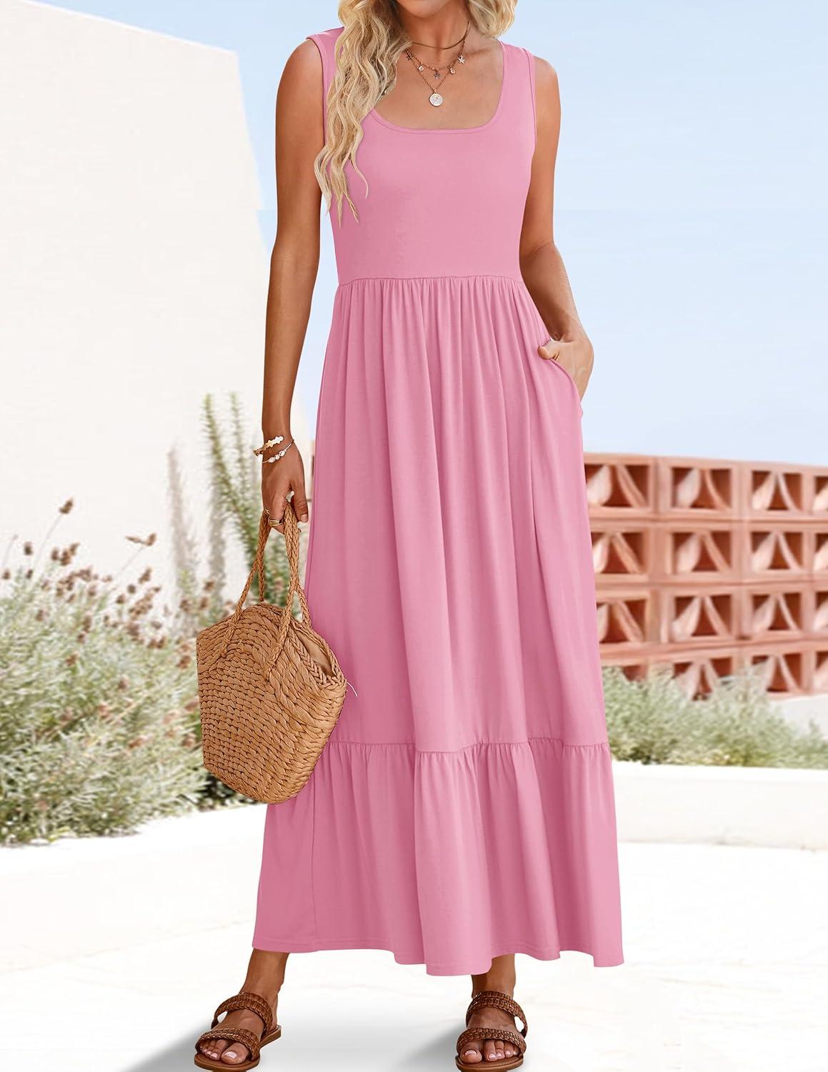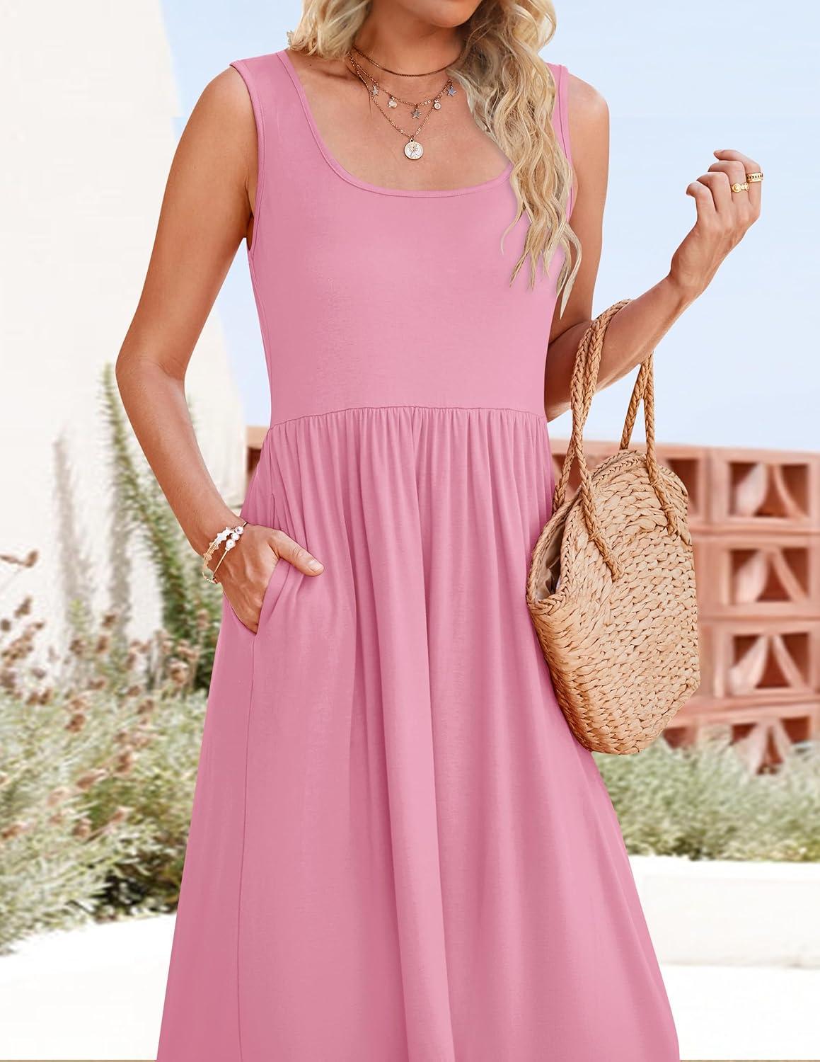 ZESICA Women’s 2025 Summer Sleeveless Dress Square Neck Pleated Swing Casual Maxi Dresses with Pockets(Pink)
