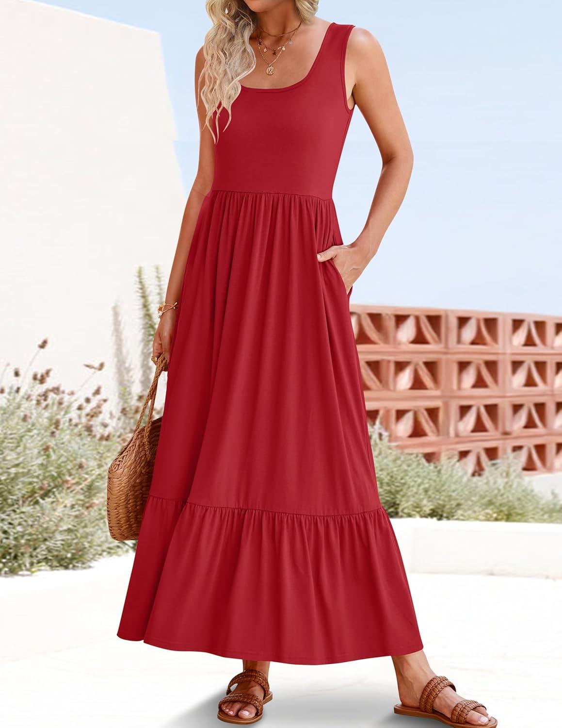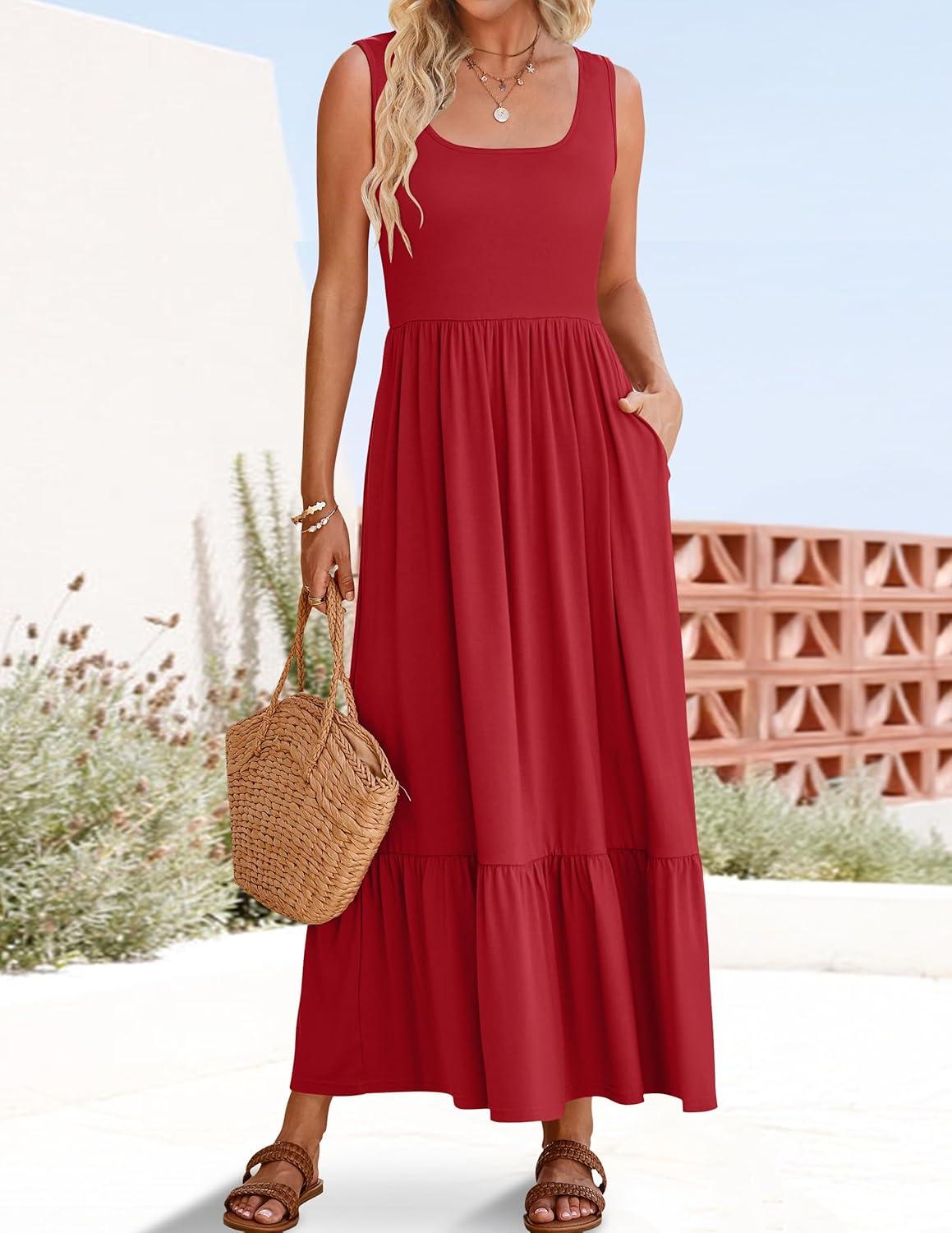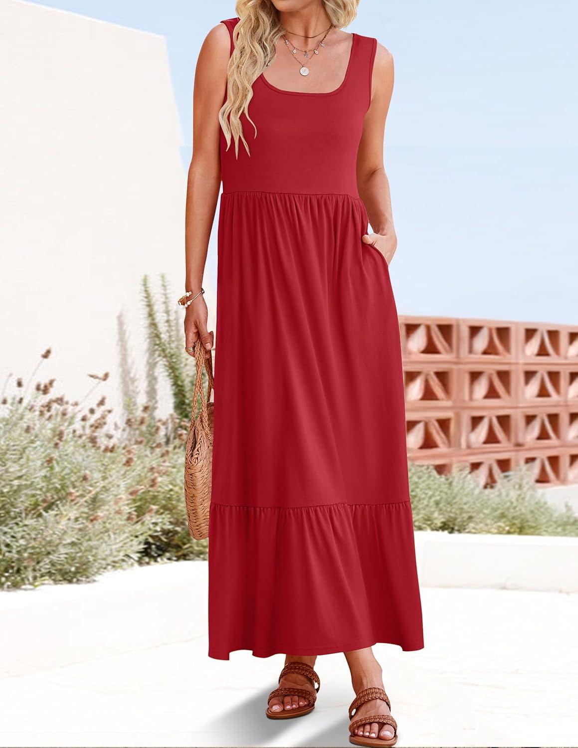 ZESICA Women’s 2025 Summer Sleeveless Dress Square Neck Pleated Swing Casual Maxi Dresses with Pockets(Red)