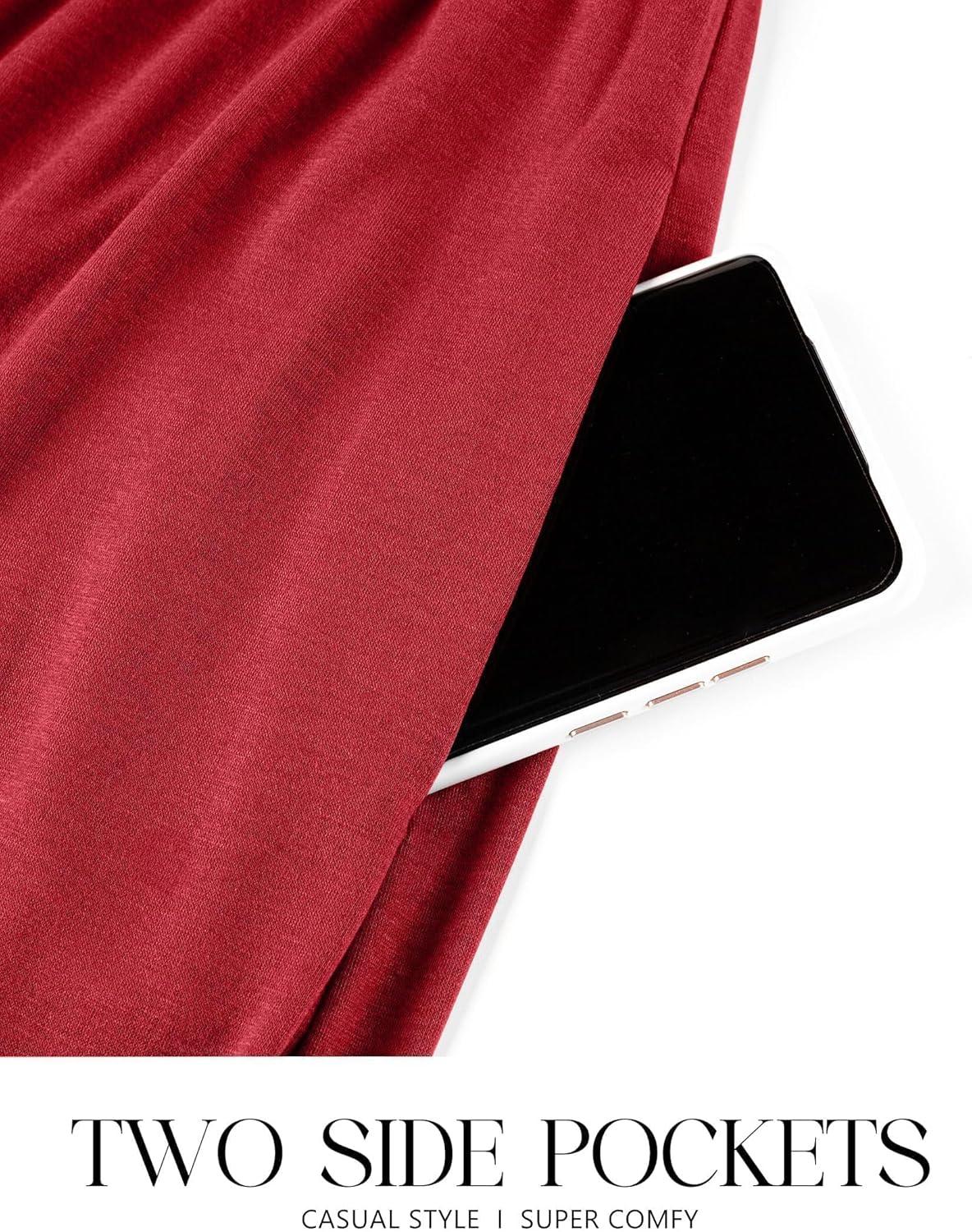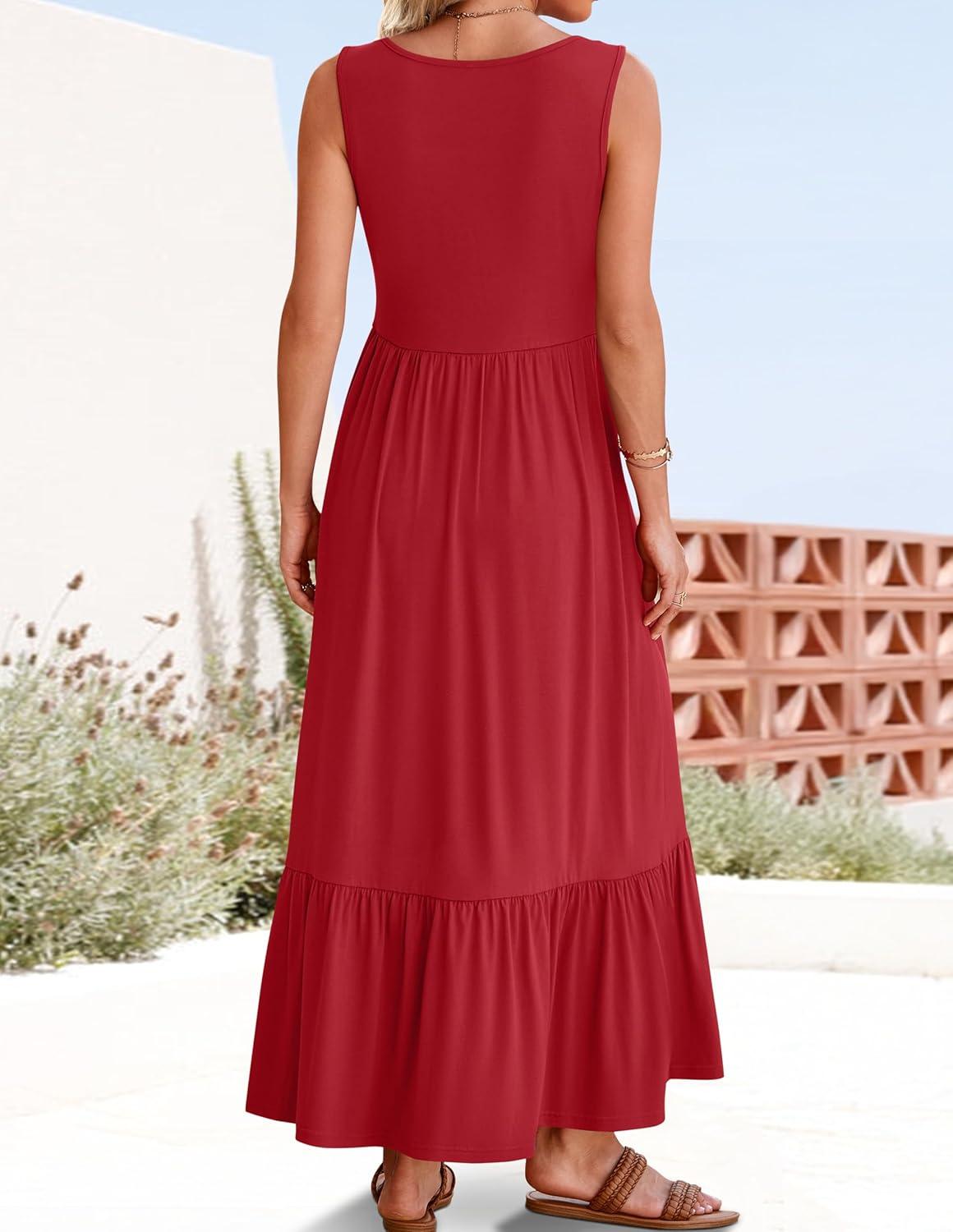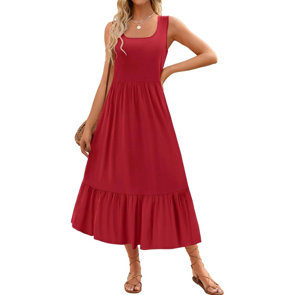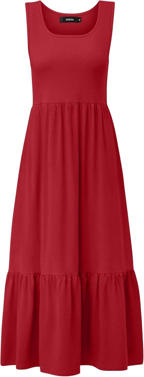 ZESICA Women’s 2025 Summer Sleeveless Dress Square Neck Pleated Swing Casual Maxi Dresses with Pockets(Red)