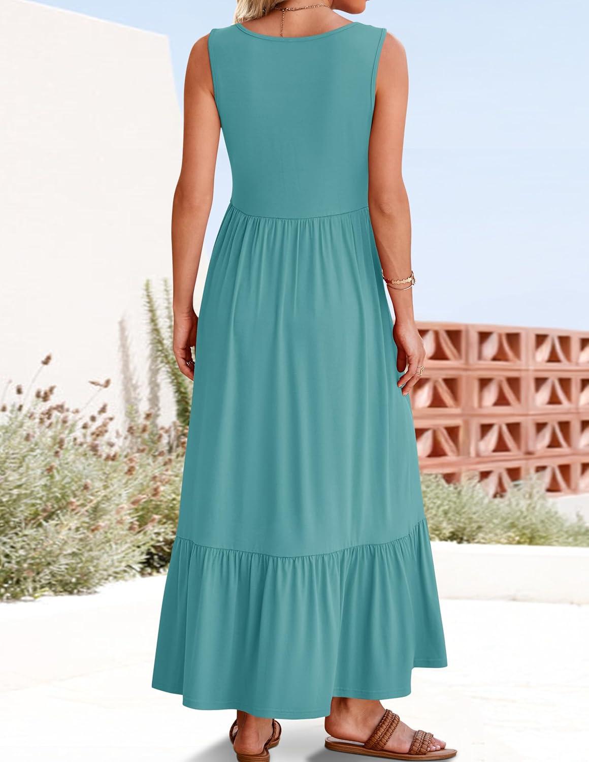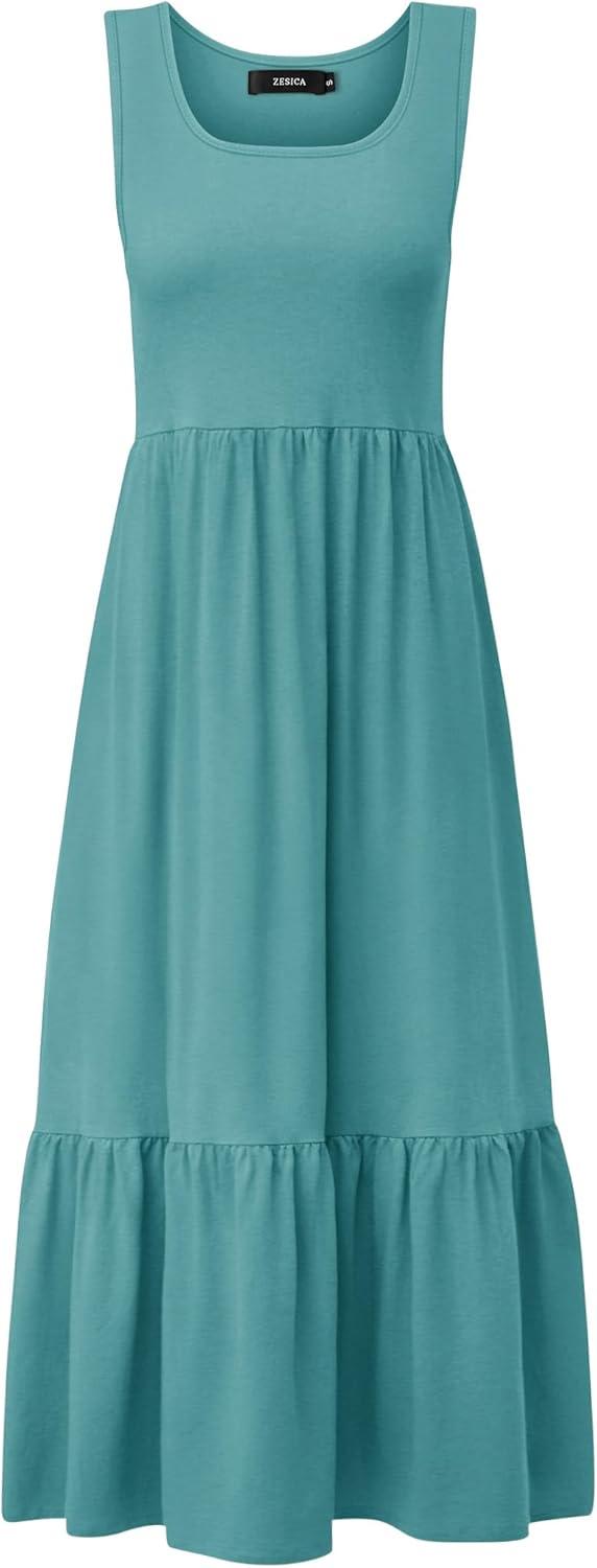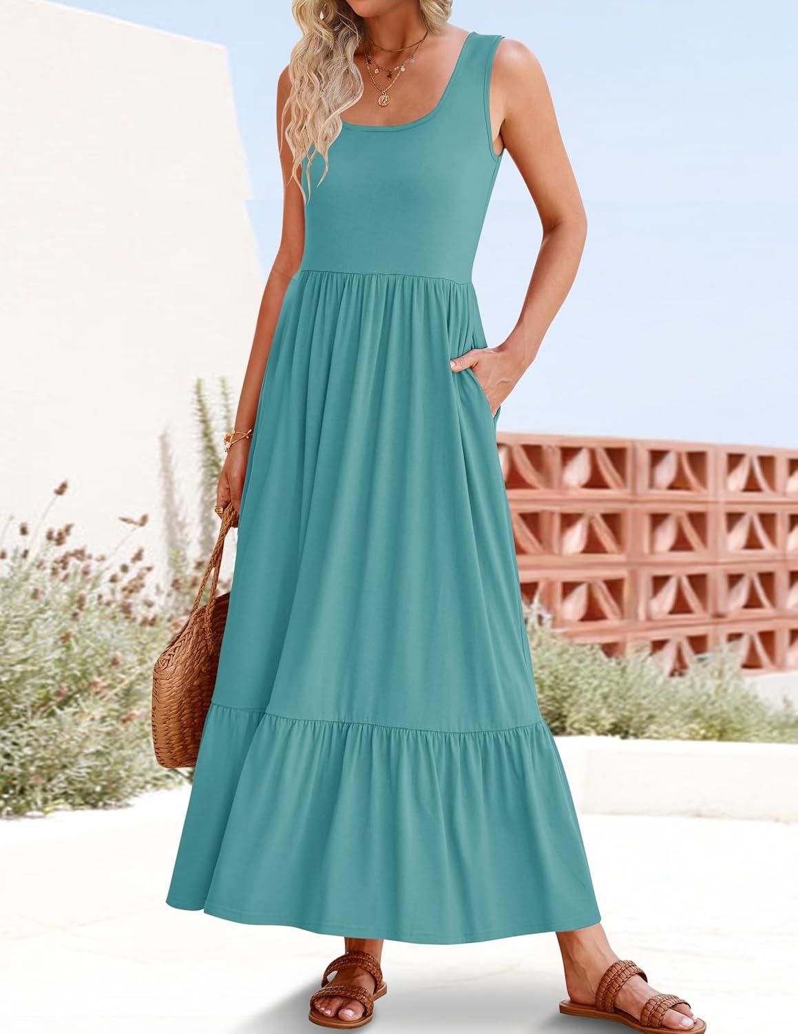 ZESICA Women's 2025 Summer Sleeveless Dress Square Neck Pleated Swing Casual Maxi Dresses with Pockets(Sage)