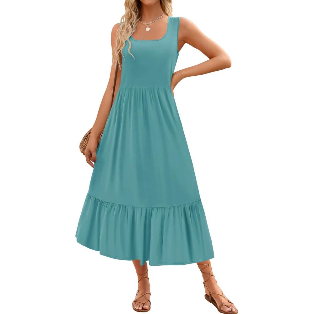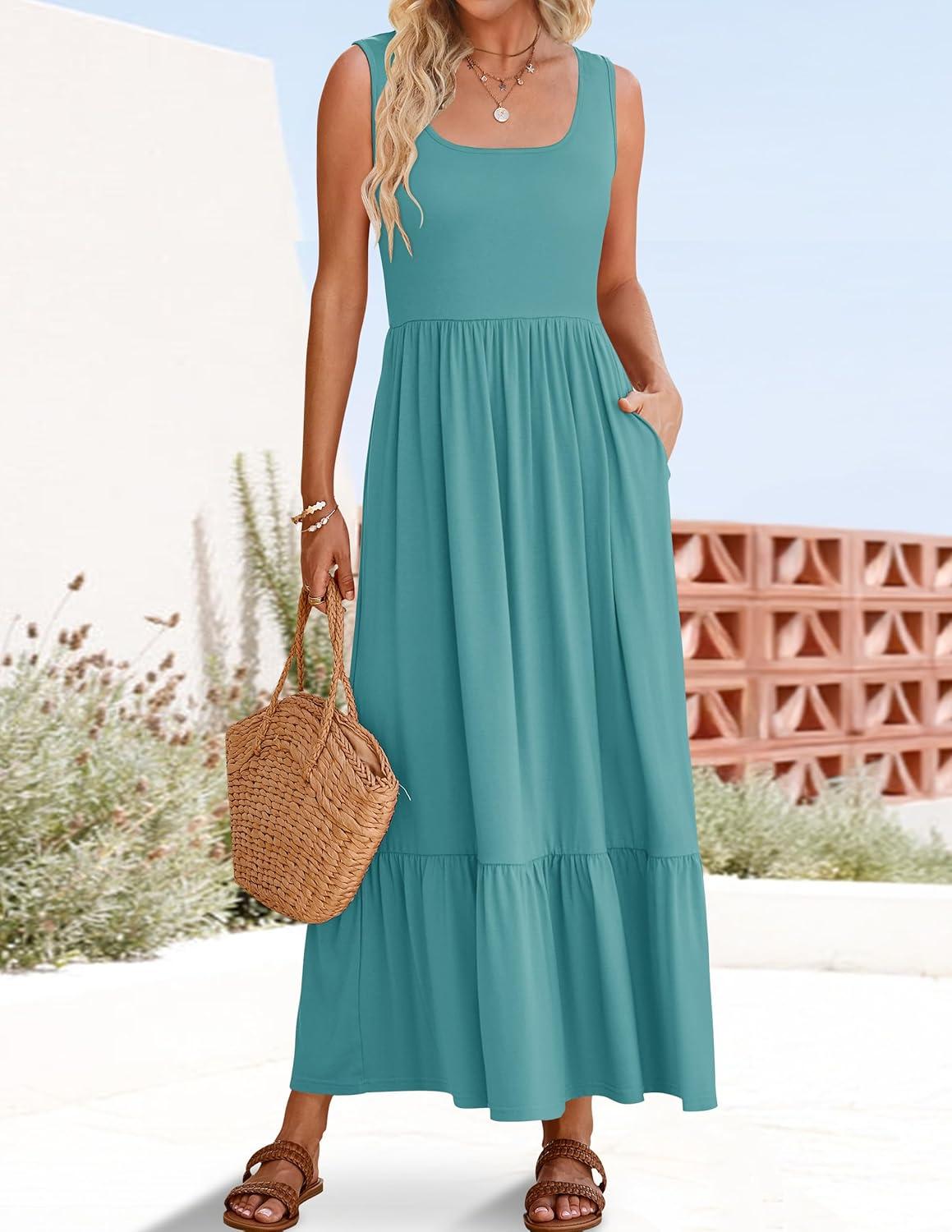 ZESICA Women’s 2025 Summer Sleeveless Dress Square Neck Pleated Swing Casual Maxi Dresses with Pockets(Sage)