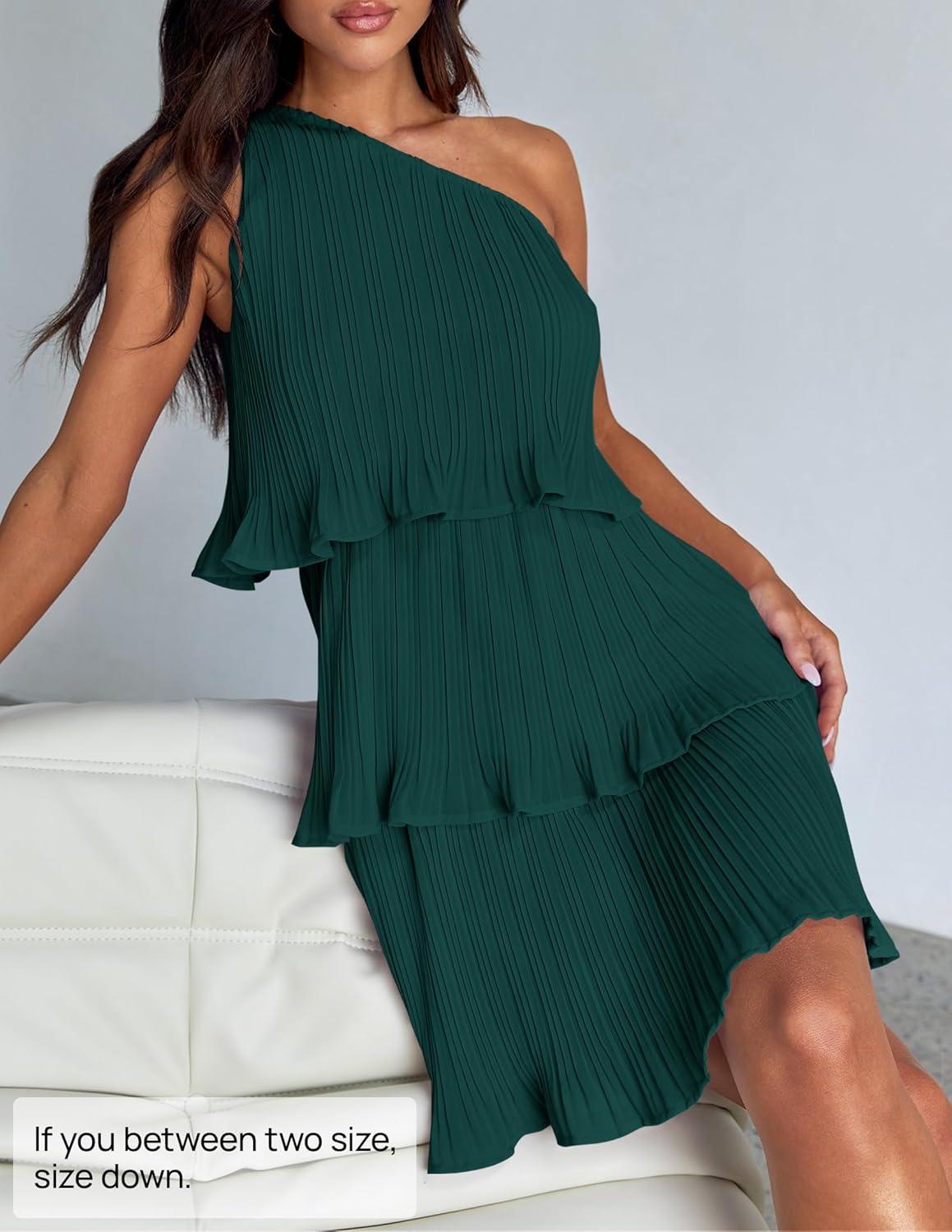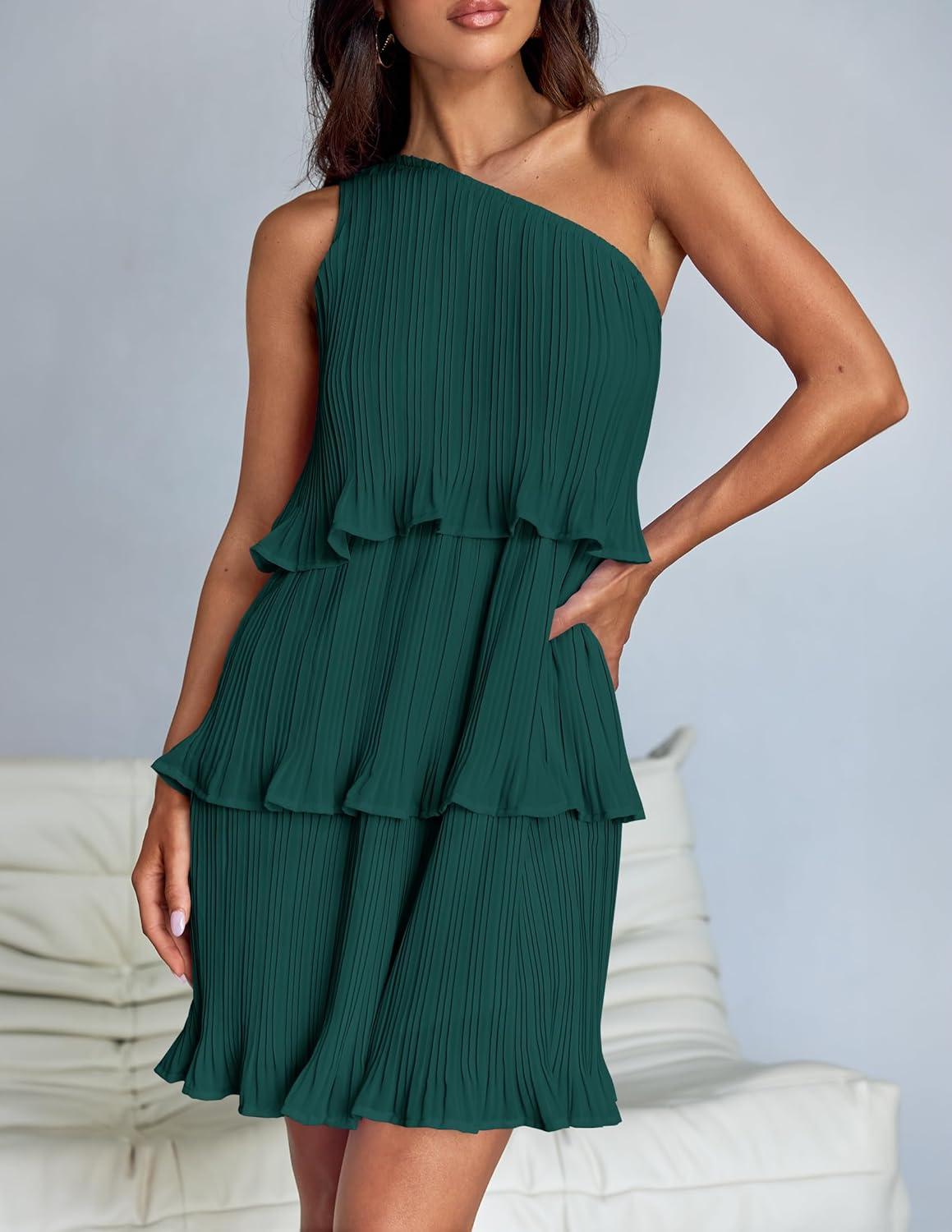 ZESICA Women’s 2025 Summer Sleeveless Mini Dress Boho One Shoulder Ruffle Tiered Layered Flowy A Line Dresses(Darkgreen)