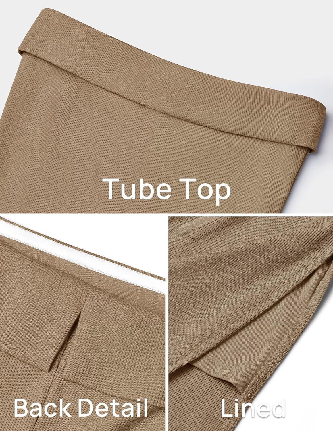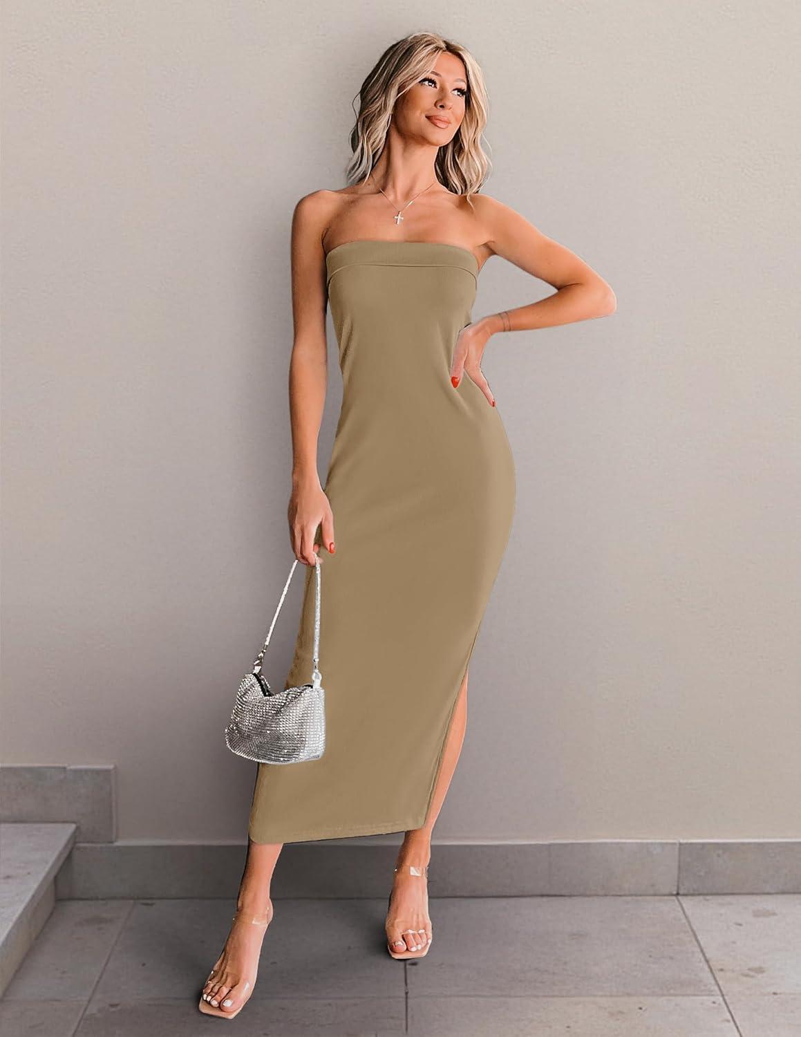 ZESICA Women’s 2025 Summer Strapless Bodycon Midi Dress Off Shoulder Sleeveless Side Slit Tube Long Club Party Dresses(Khaki)