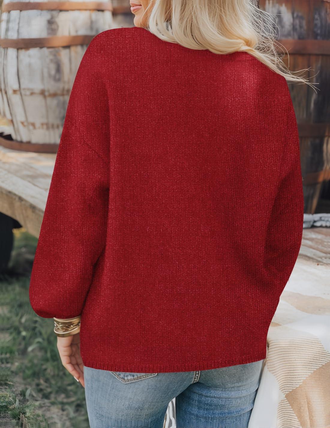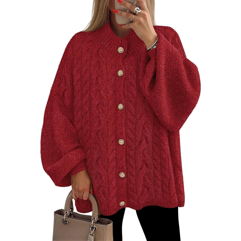 ZESICA Women’s Button Down Cardigan Sweaters 2025 Fall Lantern Long Sleeve Mock Neck Chunky Knit Outerwear Coat(Red)