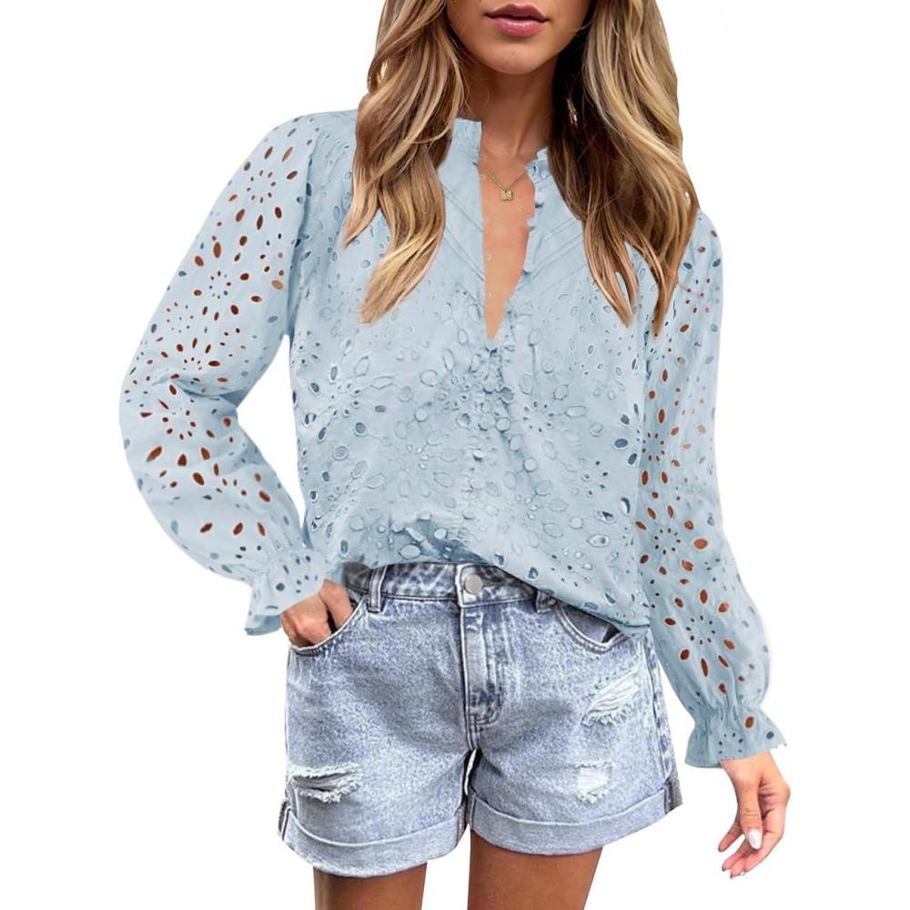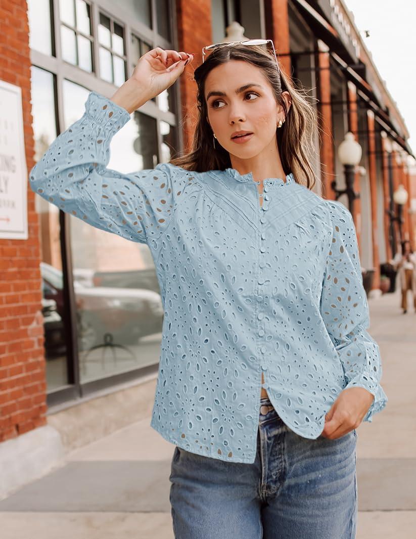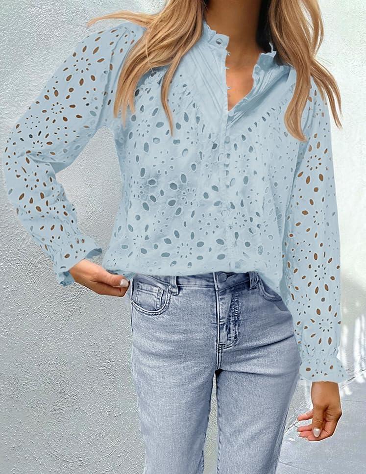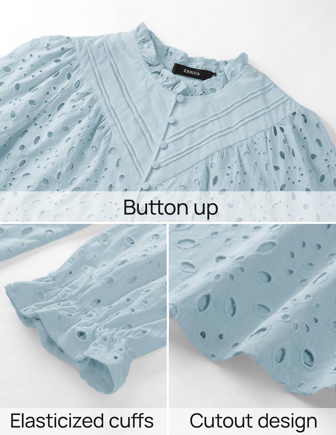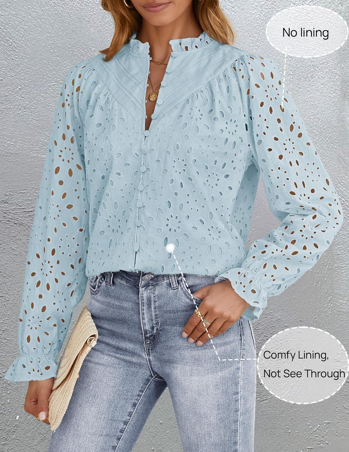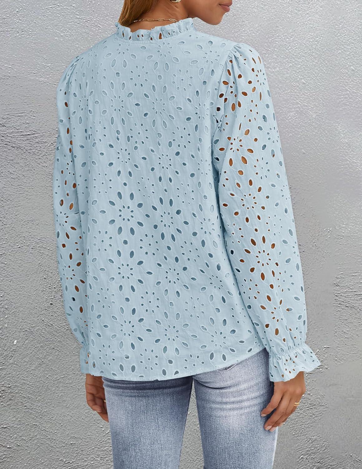 imageZESICA Womens Casual Blouse Tops Puff Long Sleeve Button V Neck Hollow Out Eyelet Lace Embroidered Shirt DressyBlue
