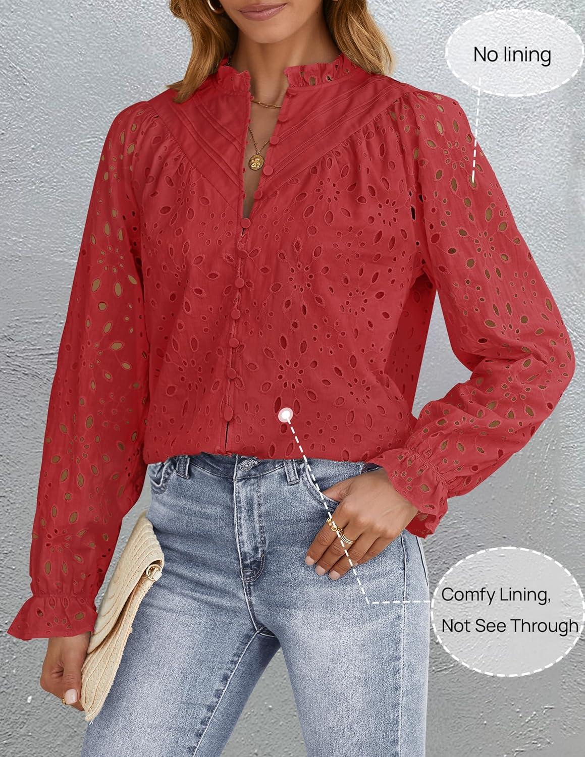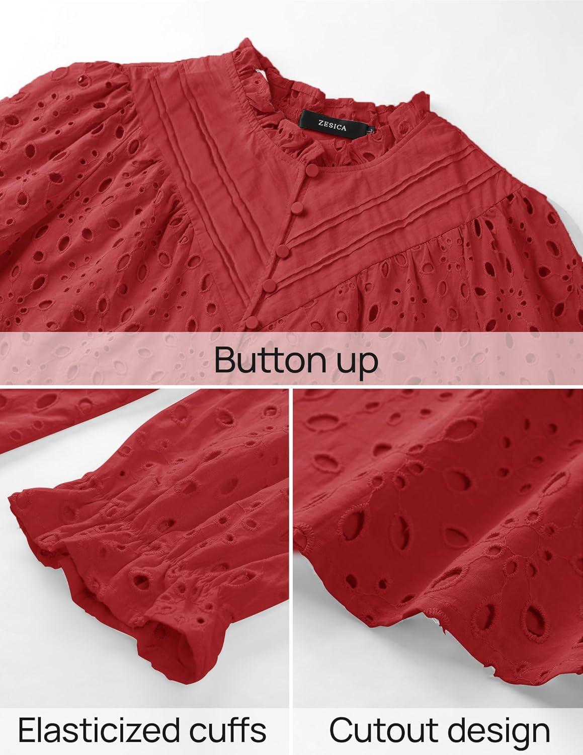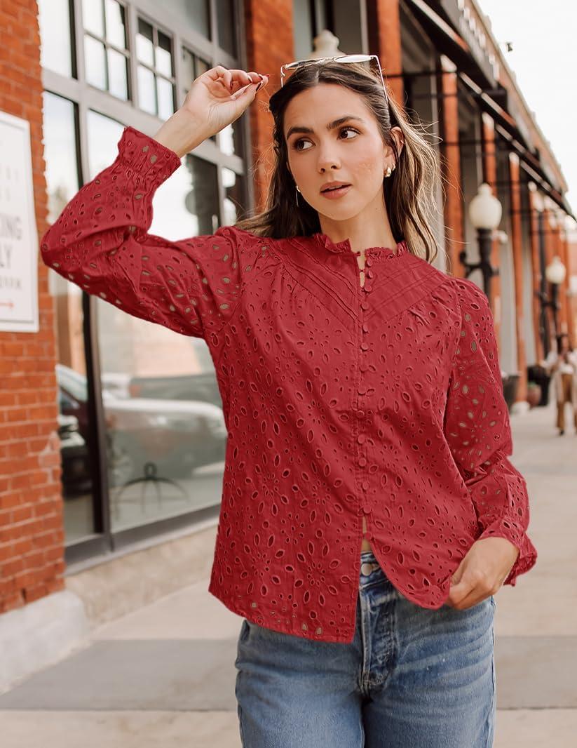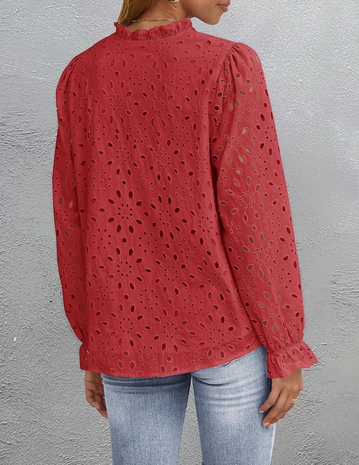 ZESICA Women’s Casual Blouse Tops Puff Long Sleeve Button V Neck Hollow Out Eyelet Lace Embroidered Shirt Dressy(Brickred)