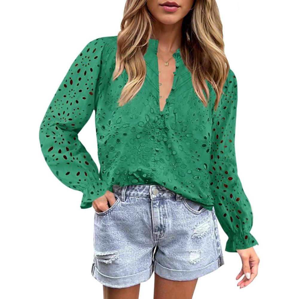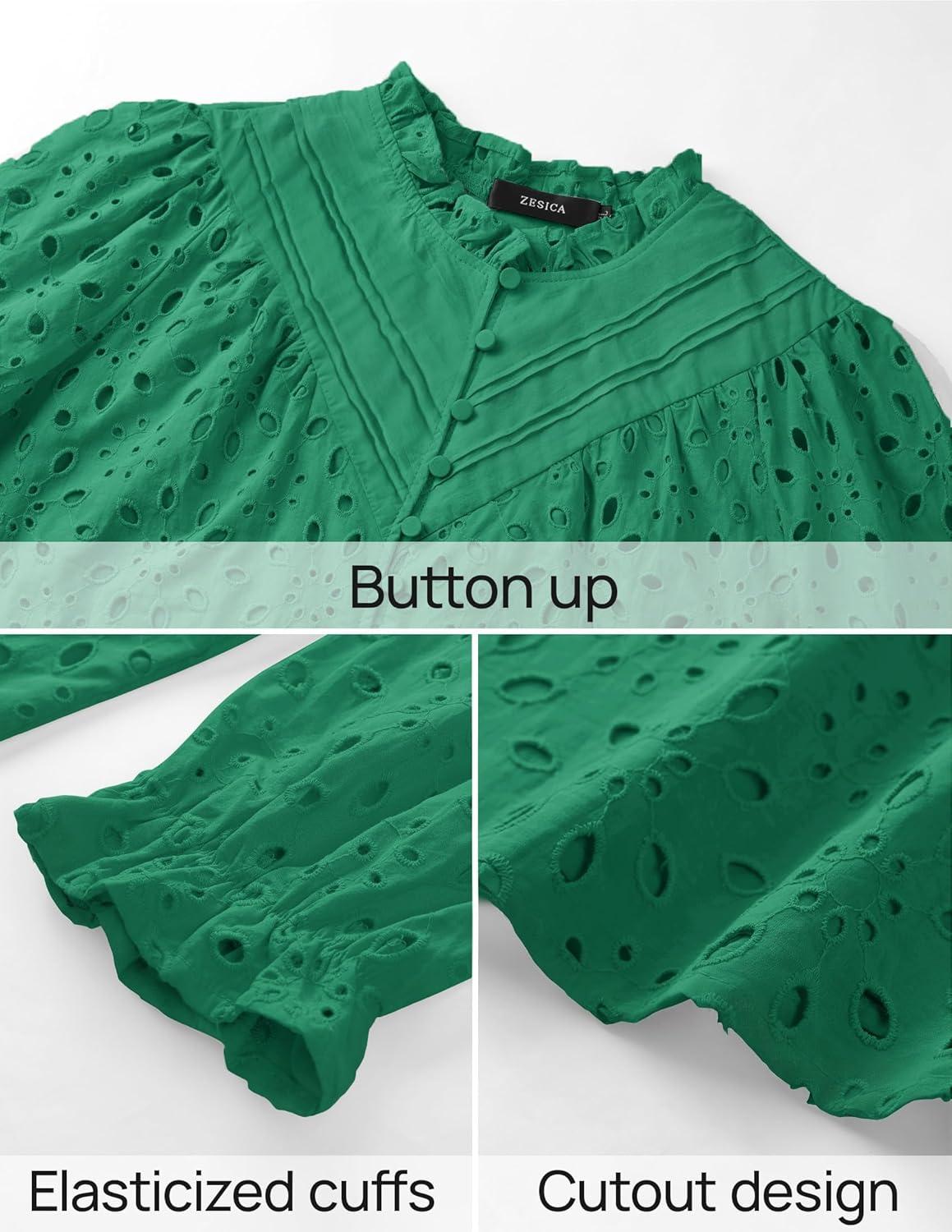 imageZESICA Womens Casual Blouse Tops Puff Long Sleeve Button V Neck Hollow Out Eyelet Lace Embroidered Shirt DressyGreen