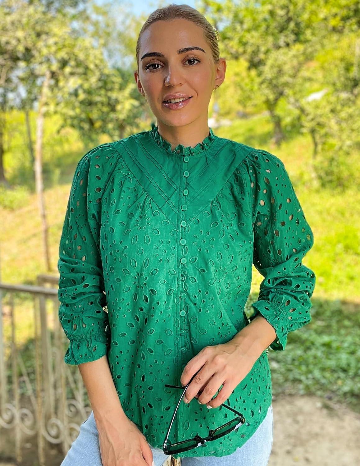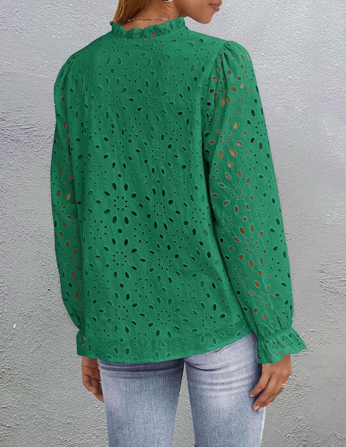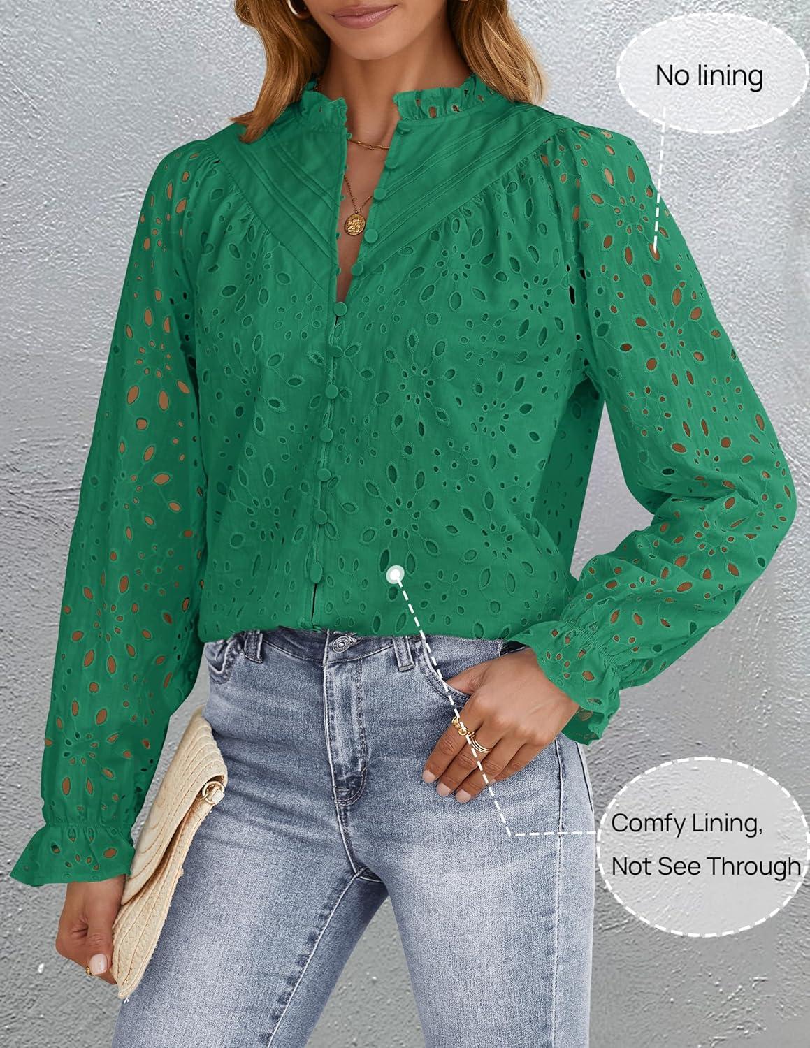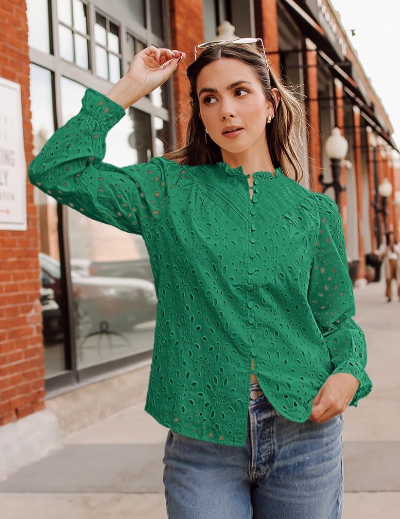 ZESICA Women’s Casual Blouse Tops Puff Long Sleeve Button V Neck Hollow Out Eyelet Lace Embroidered Shirt Dressy(Green)