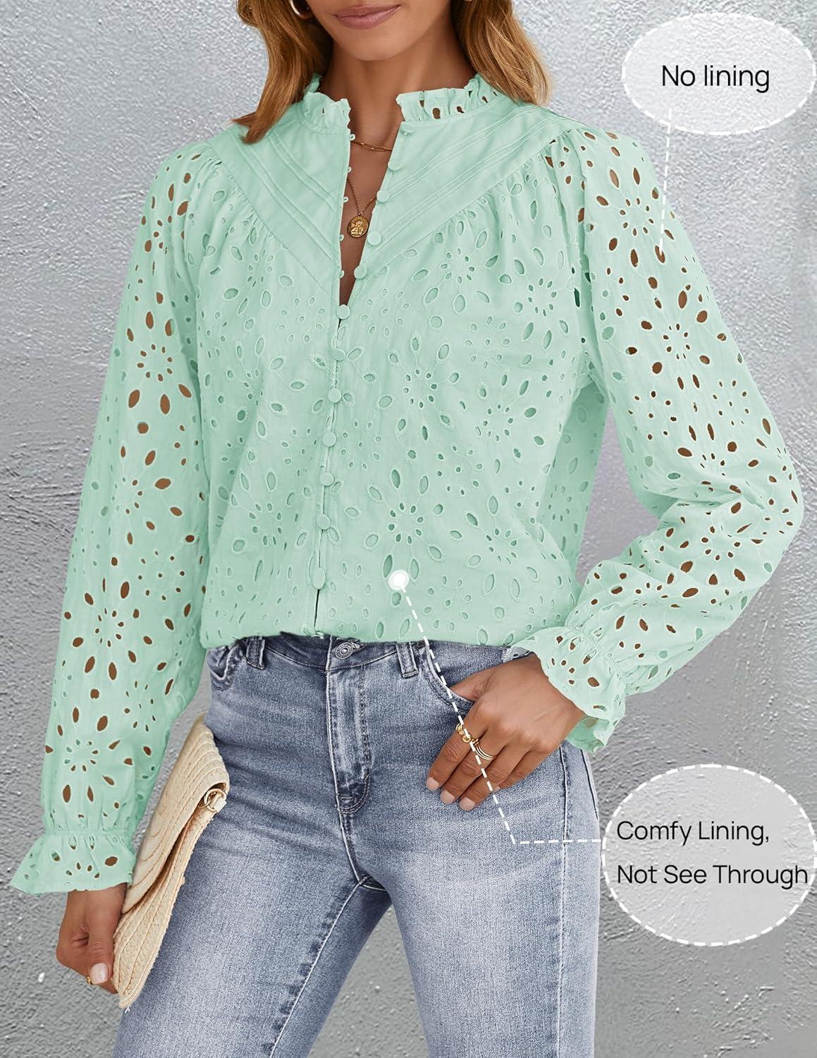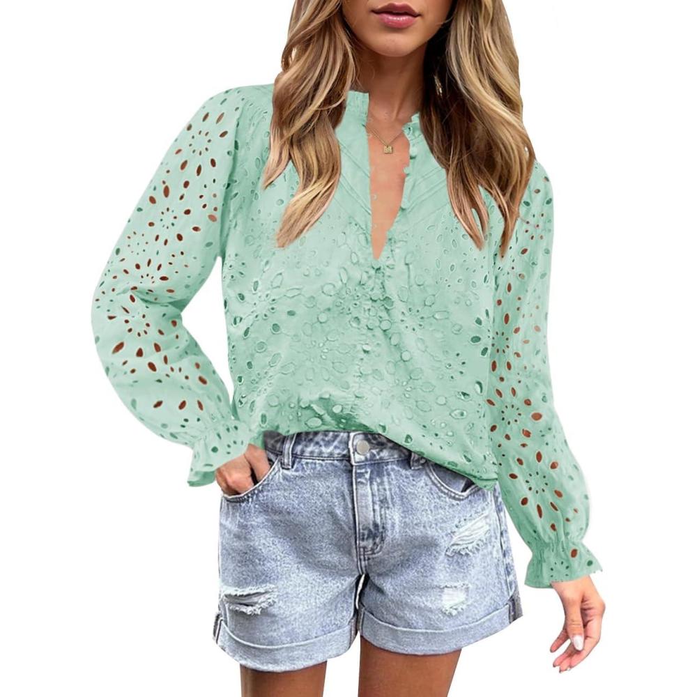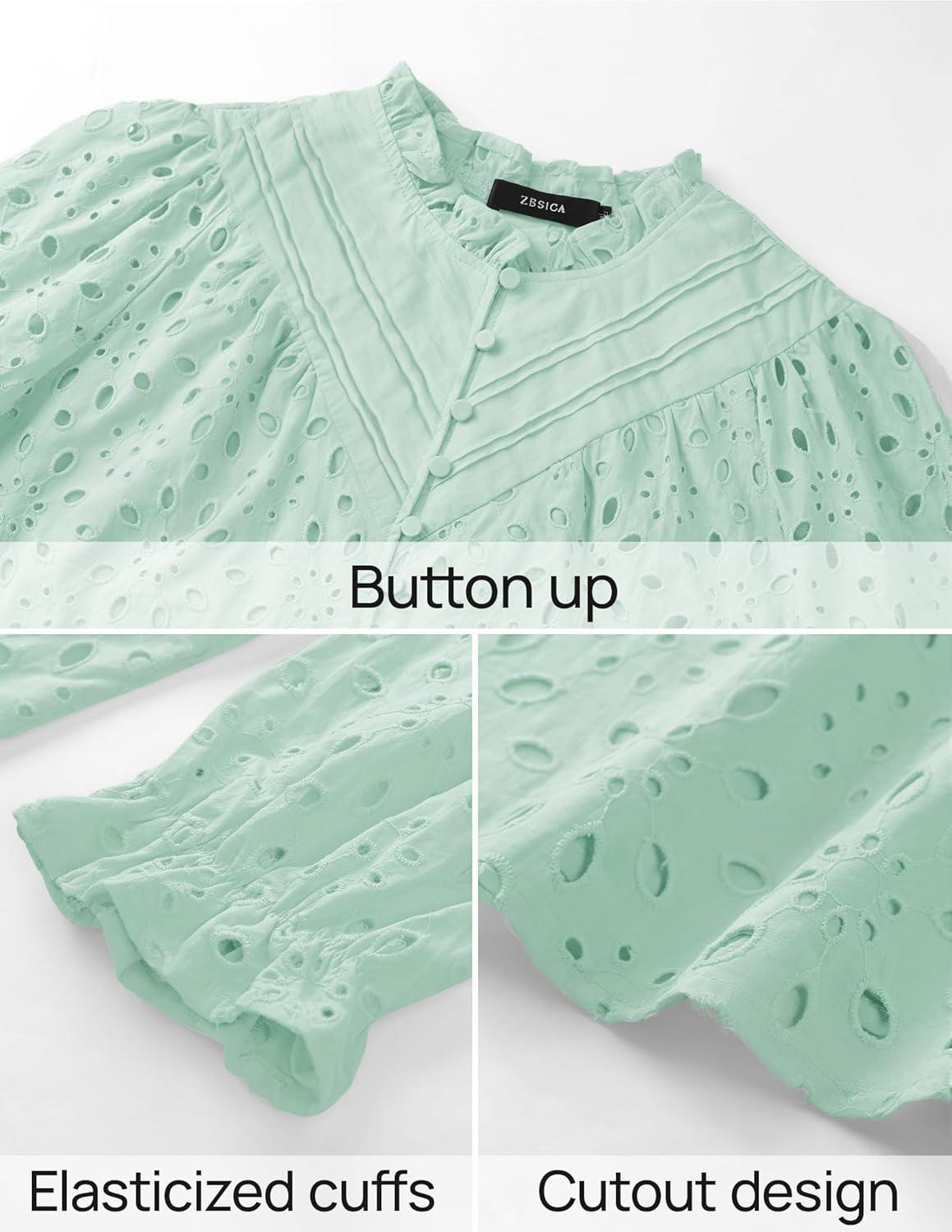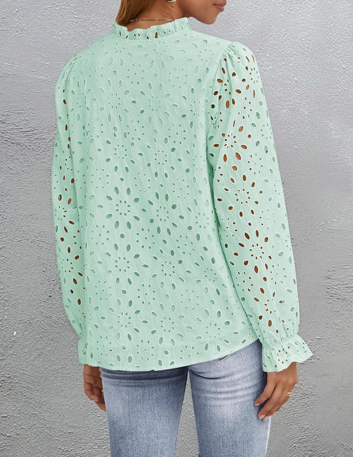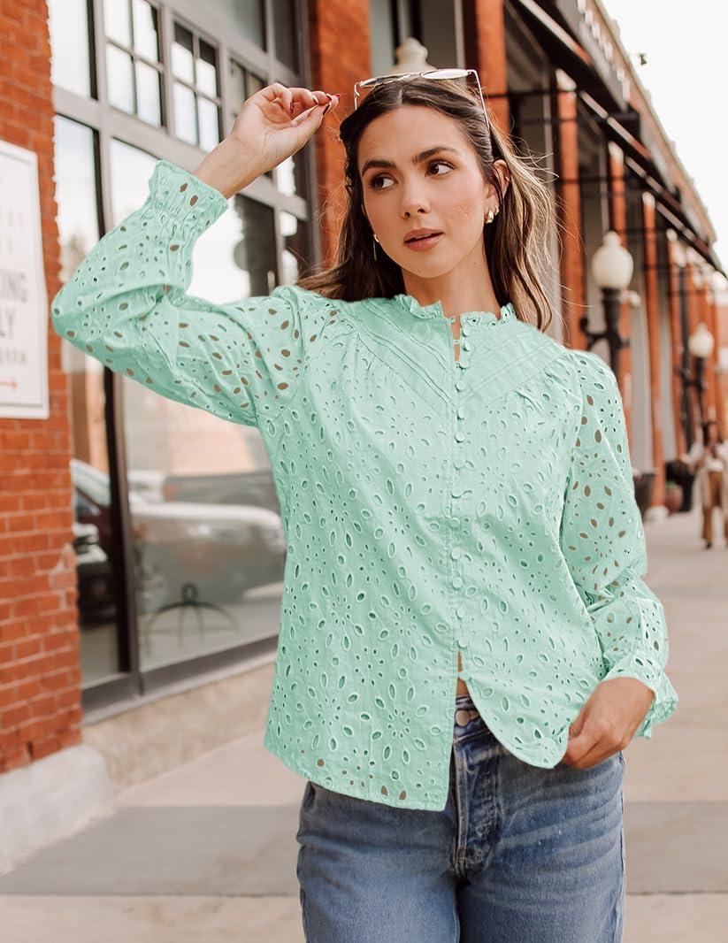 ZESICA Women’s Casual Blouse Tops Puff Long Sleeve Button V Neck Hollow Out Eyelet Lace Embroidered Shirt Dressy(Mint)