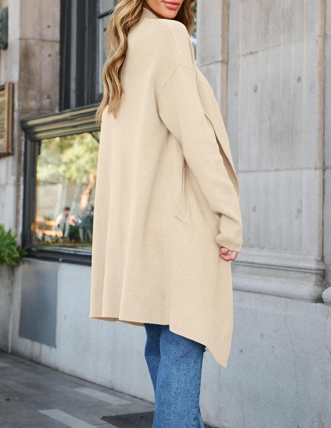 ZESICA Women’s Casual Lapel Cardigan Long Sleeve Open Front Irregular Hem Soft Knitted Sweater Coat with Pockets(Beige)