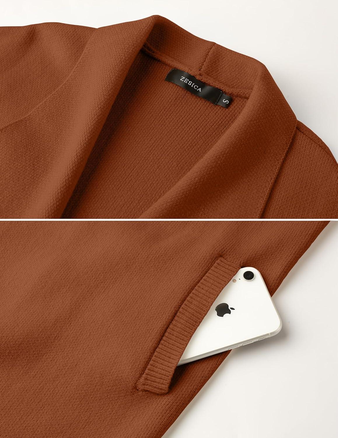 ZESICA Women’s Casual Lapel Cardigan Long Sleeve Open Front Irregular Hem Soft Knitted Sweater Coat with Pockets(Caramel)