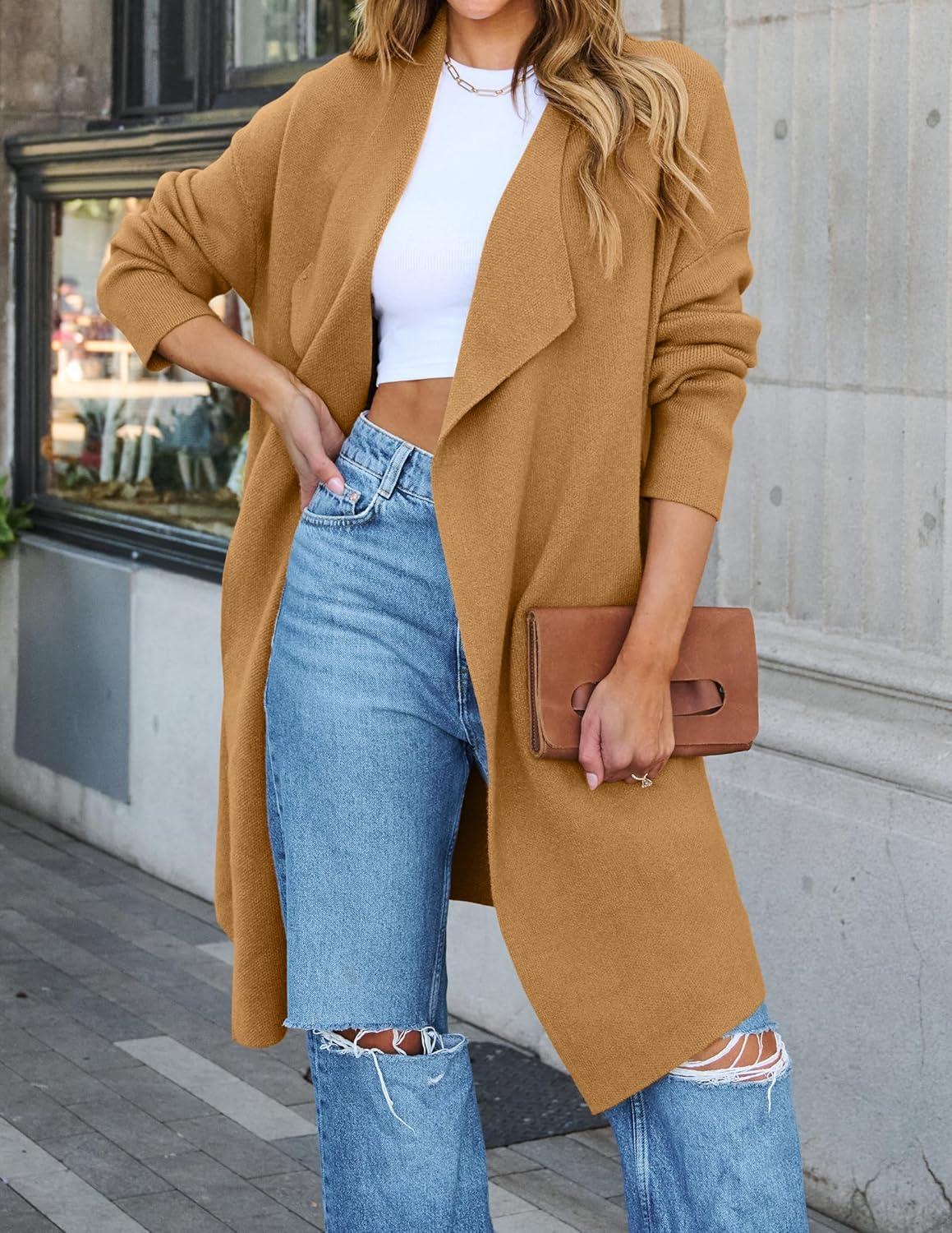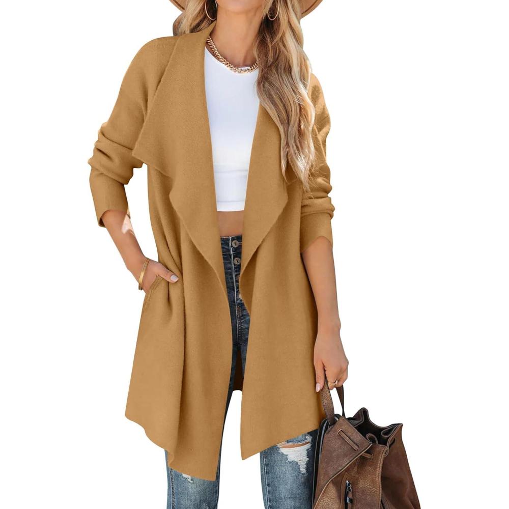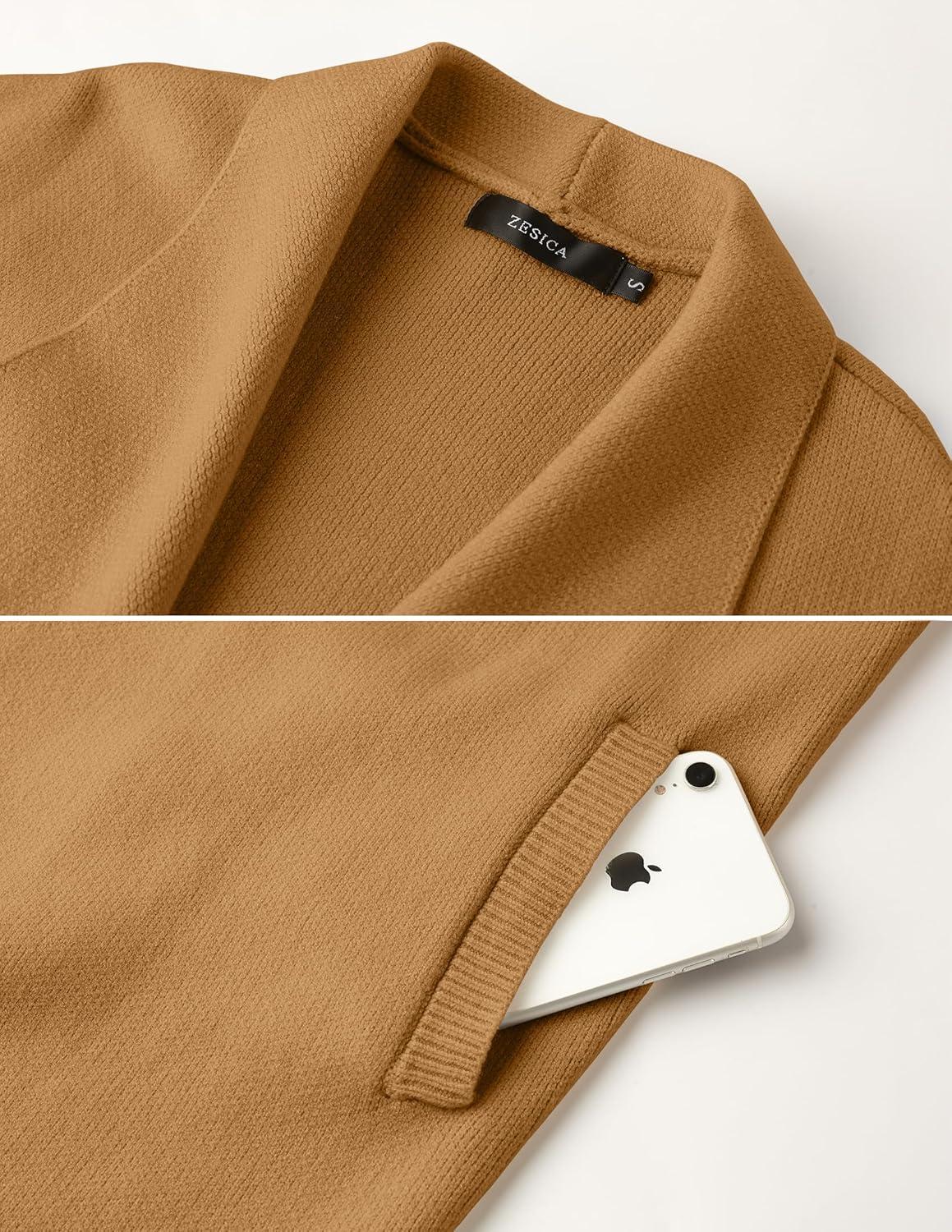 ZESICA Women’s Casual Lapel Cardigan Long Sleeve Open Front Irregular Hem Soft Knitted Sweater Coat with Pockets(Caramel)