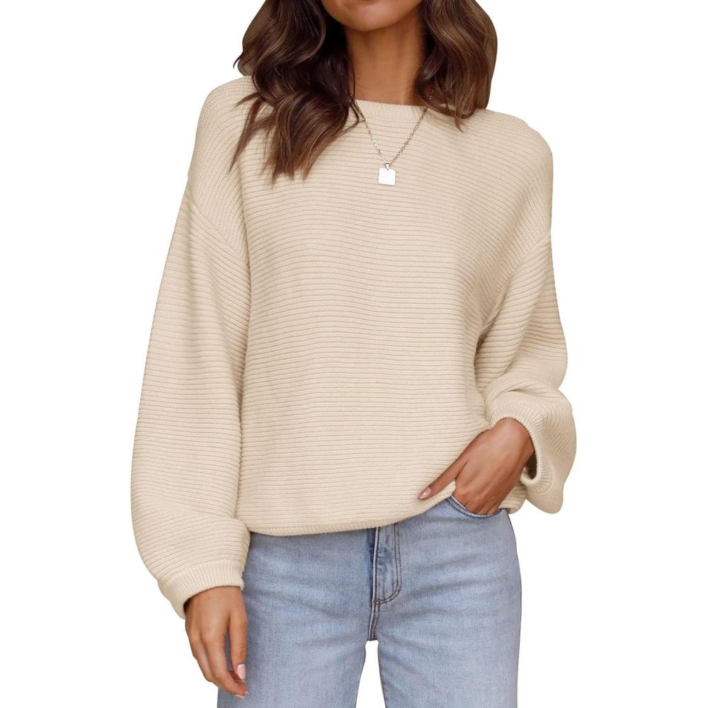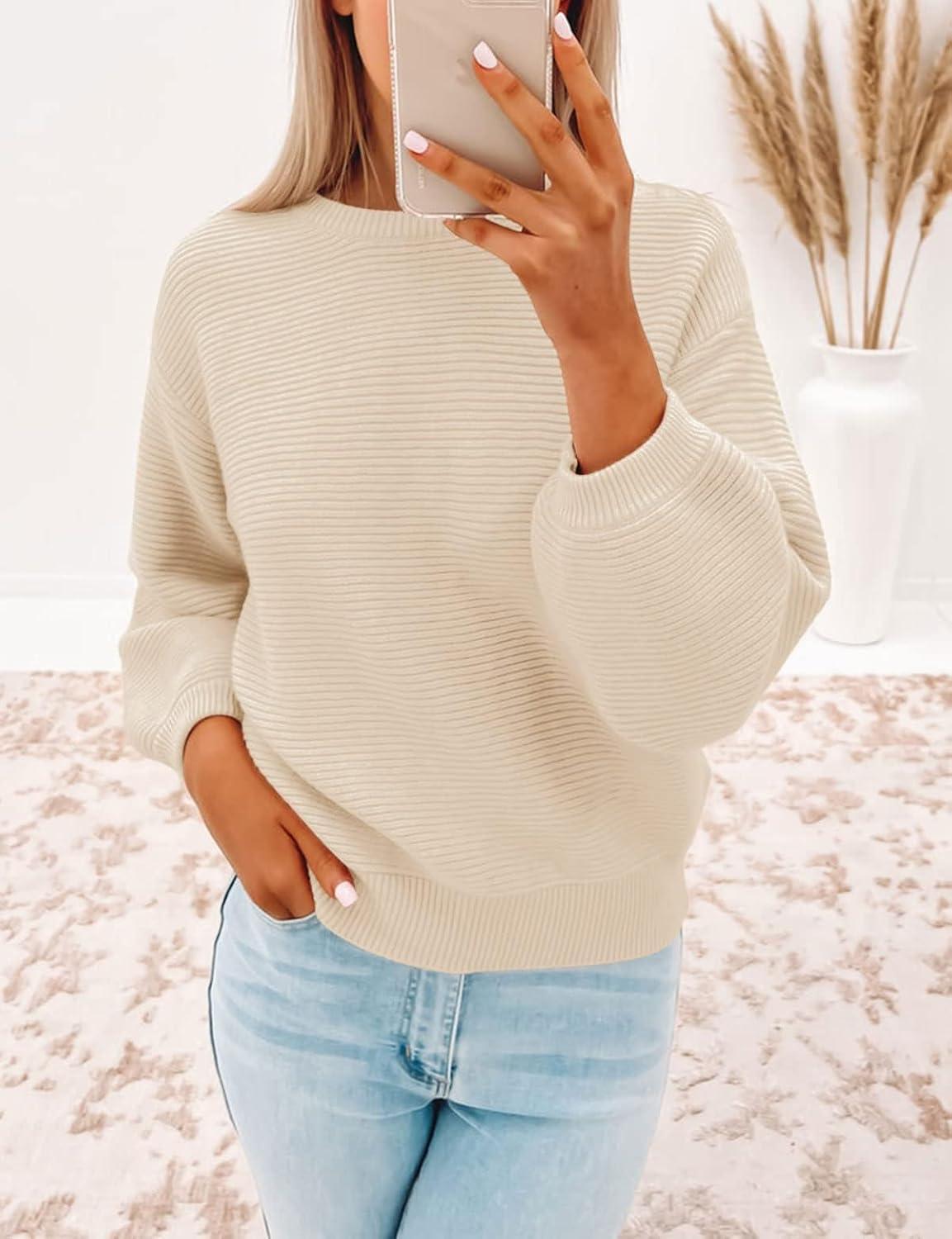 ZESICA Women’s Crew Neck Long Lantern Sleeve Fall 2025 Casual Loose Ribbed Knit Solid Soft Pullover Sweater Tops(Apricot)