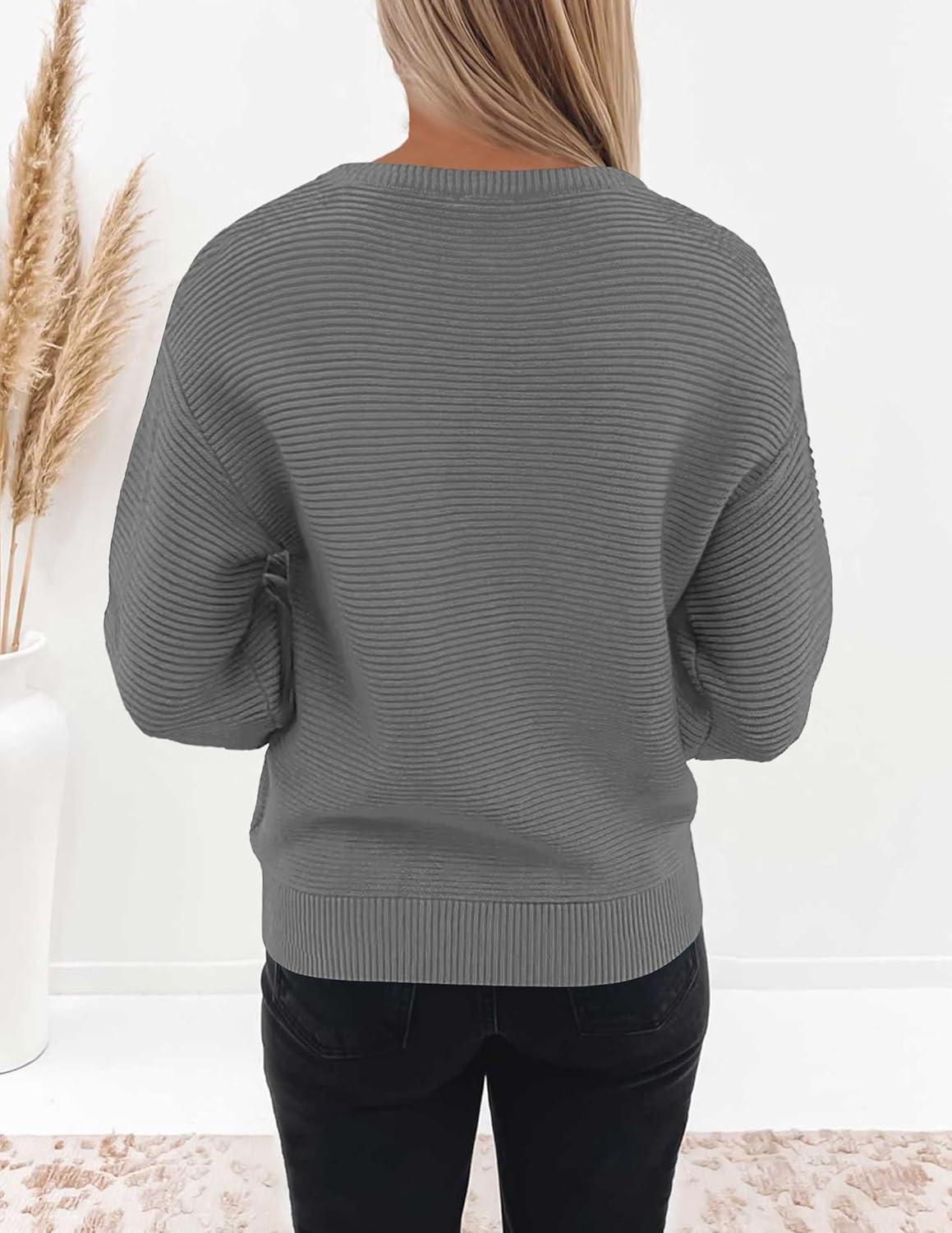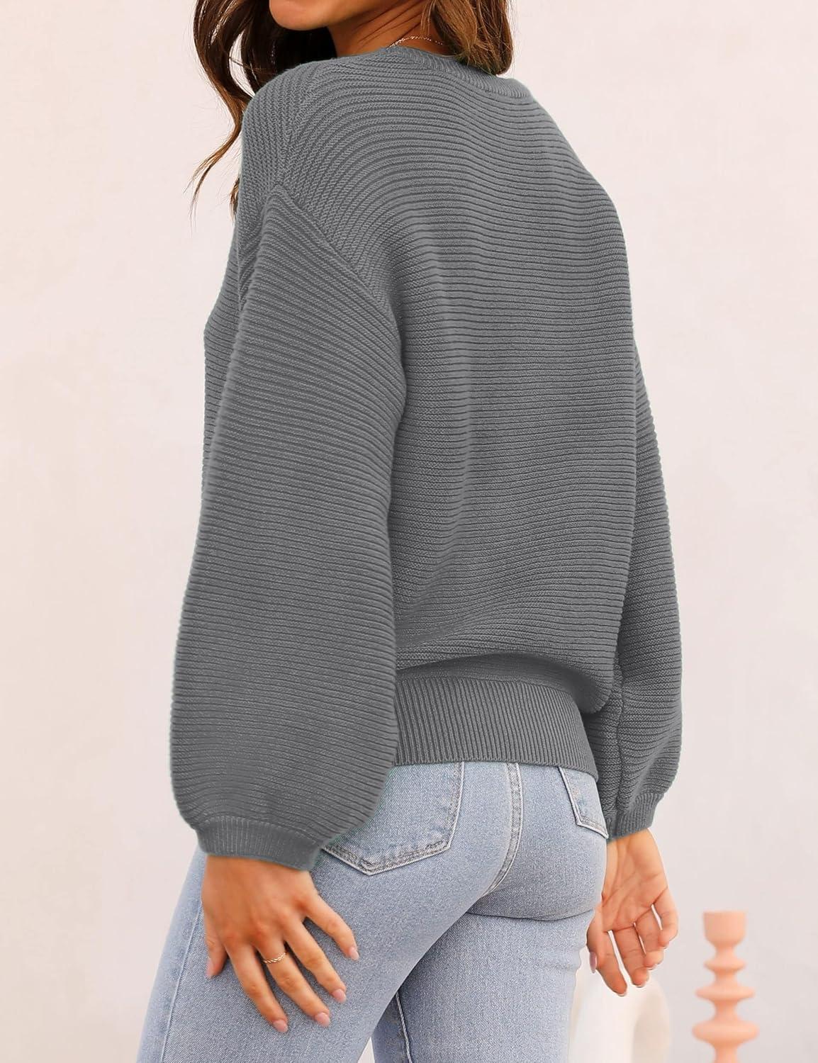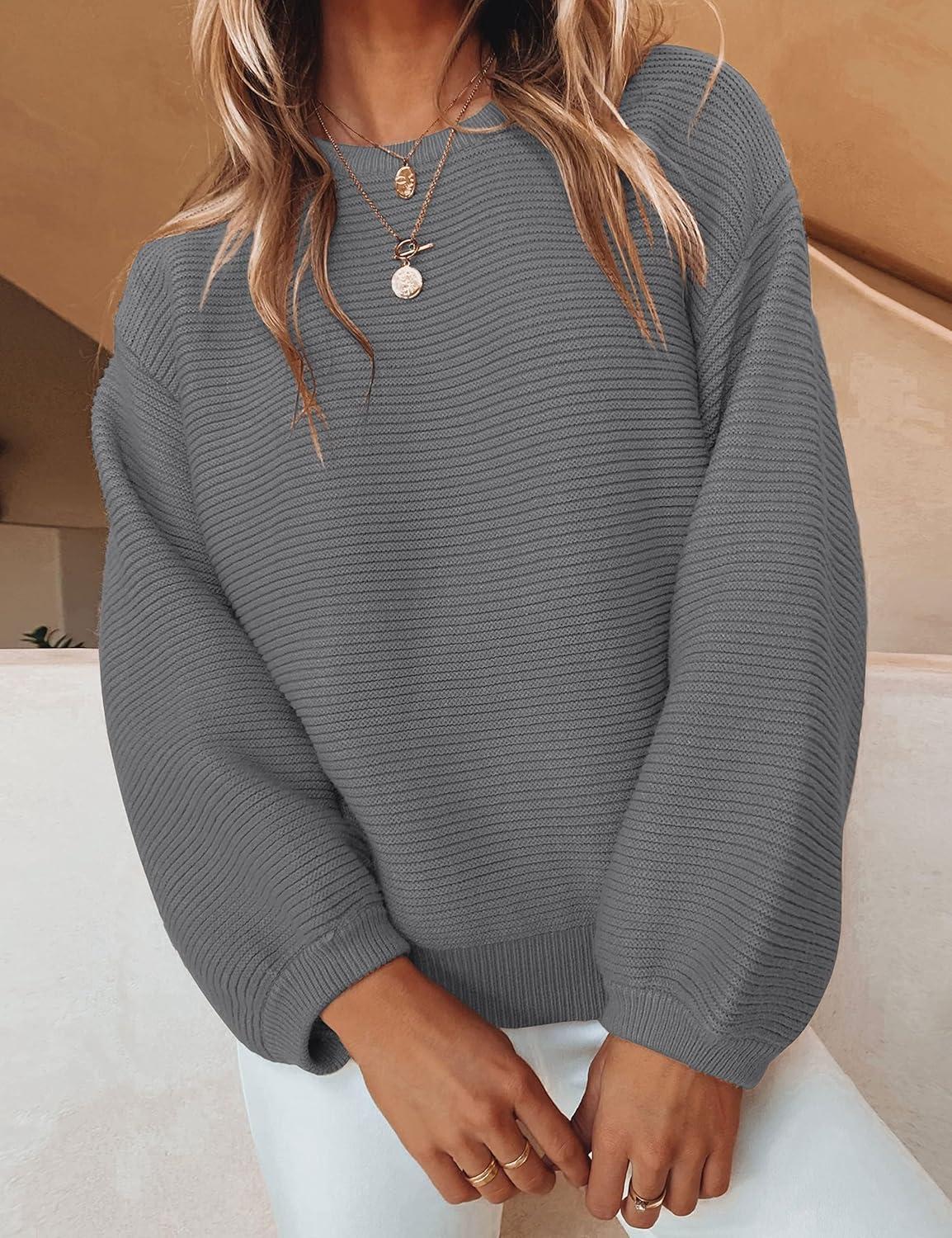 ZESICA Women’s Crew Neck Long Lantern Sleeve Fall 2025 Casual Loose Ribbed Knit Solid Soft Pullover Sweater Tops(Darkgrey)
