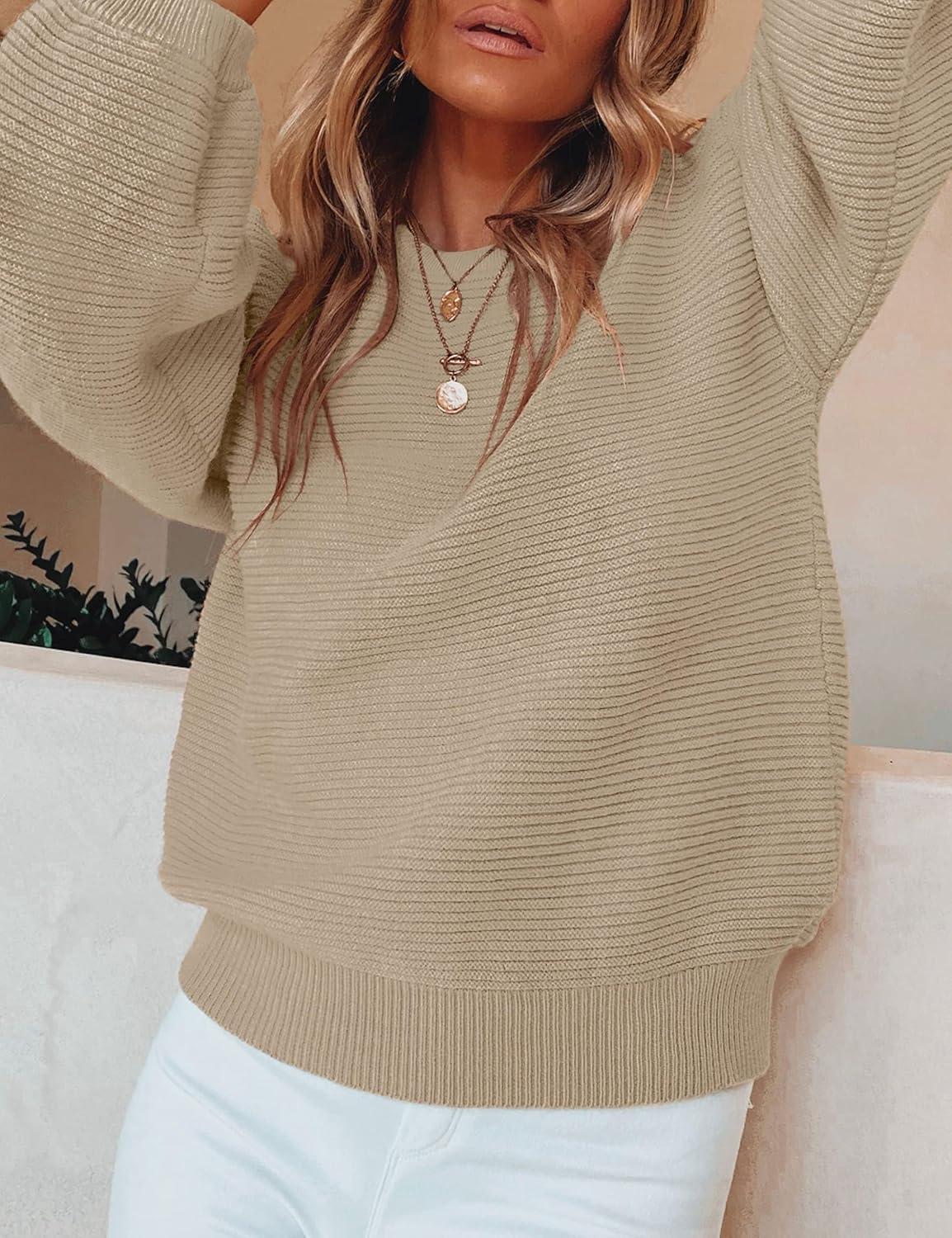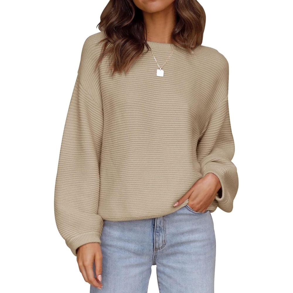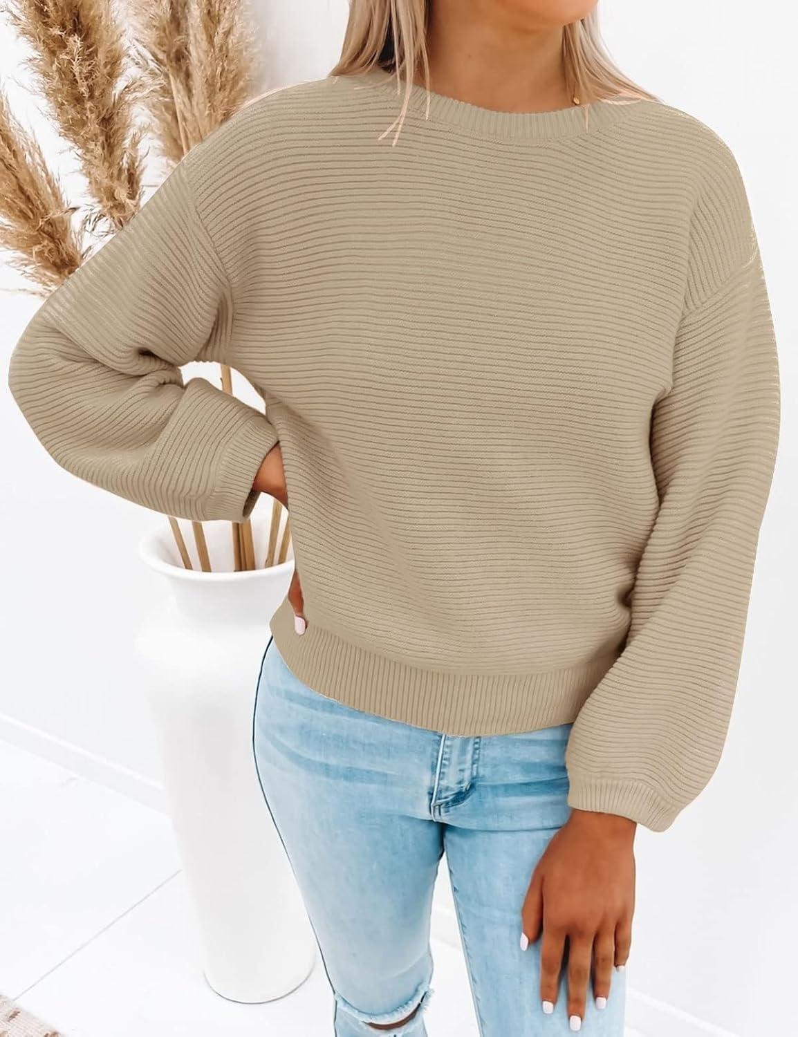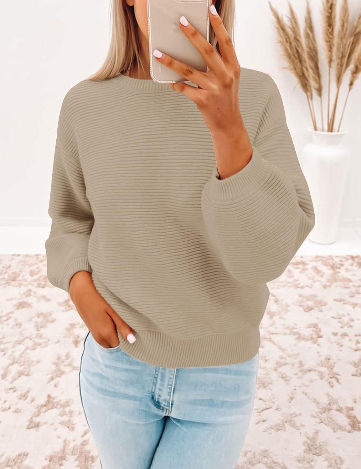ZESICA Women’s Crew Neck Long Lantern Sleeve Fall 2025 Casual Loose Ribbed Knit Solid Soft Pullover Sweater Tops(Khaki)