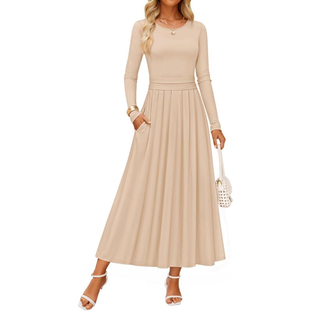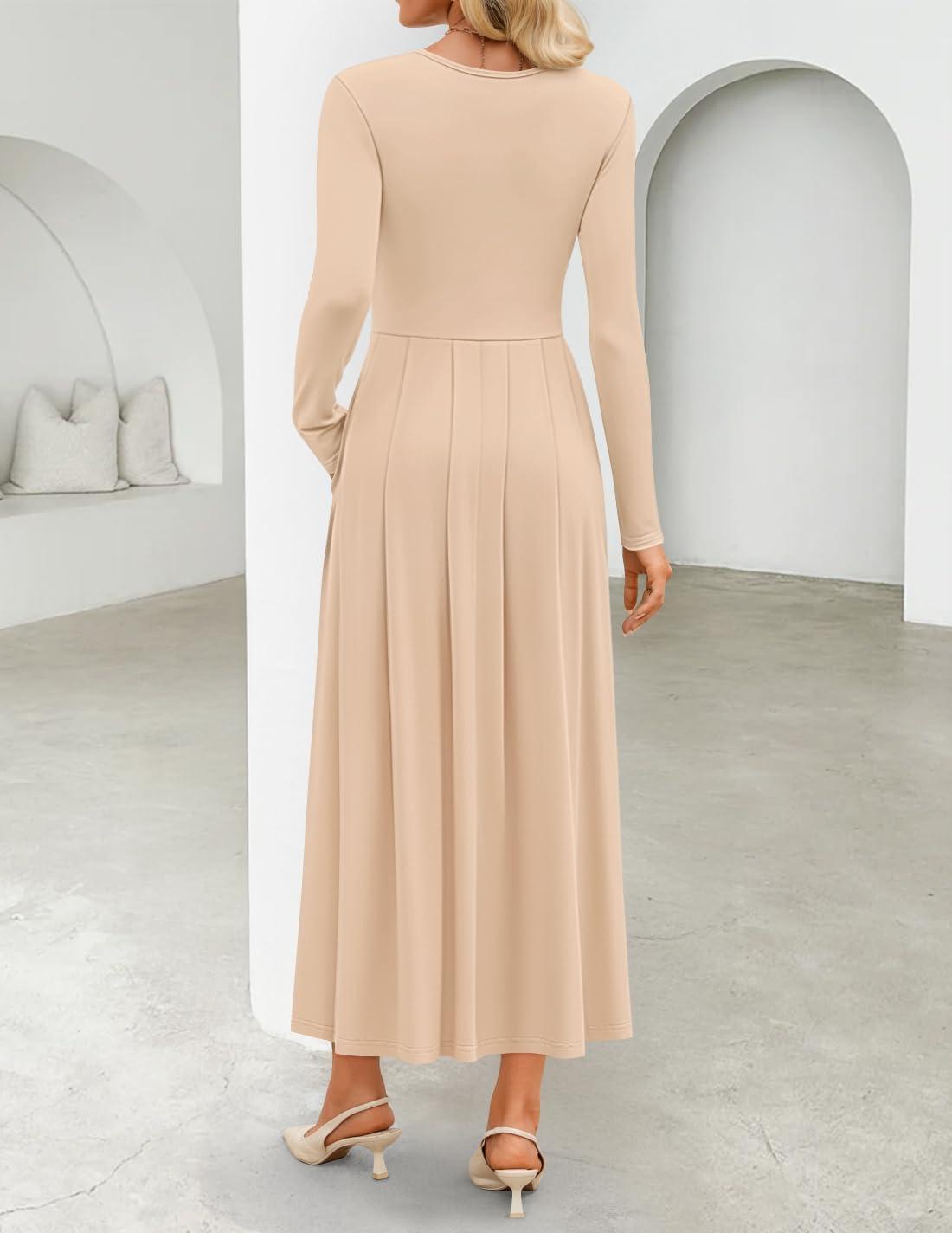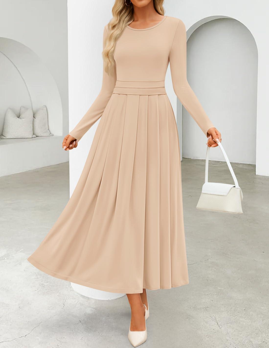 ZESICA Women’s Elegant Long Sleeve Maxi Dress 2025 Fall Crewneck Knit High Waist Pleated Flowy A Line Casual Party Dresses(Apricot)