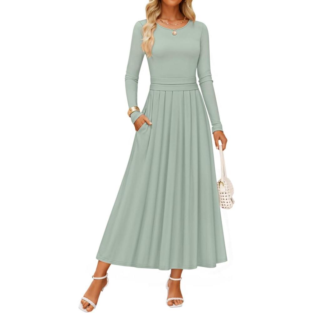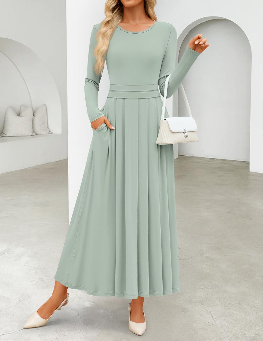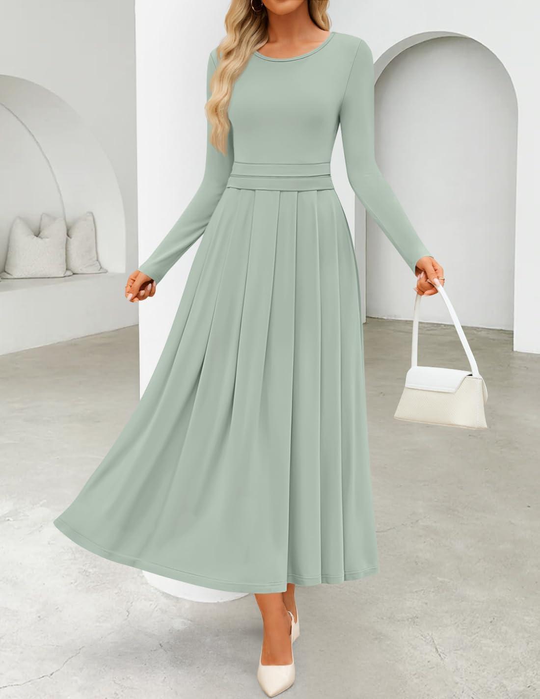 ZESICA Women’s Elegant Long Sleeve Maxi Dress 2025 Fall Crewneck Knit High Waist Pleated Flowy A Line Casual Party Dresses(Green)