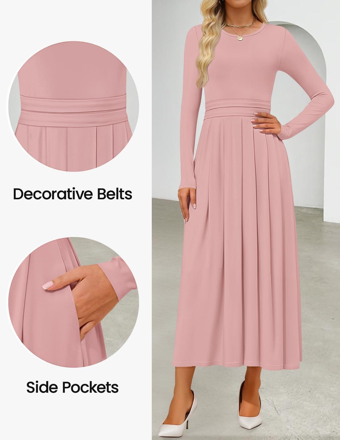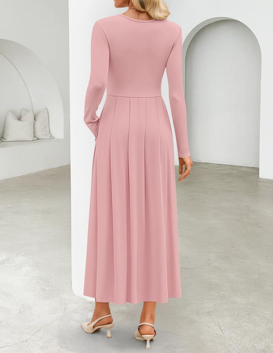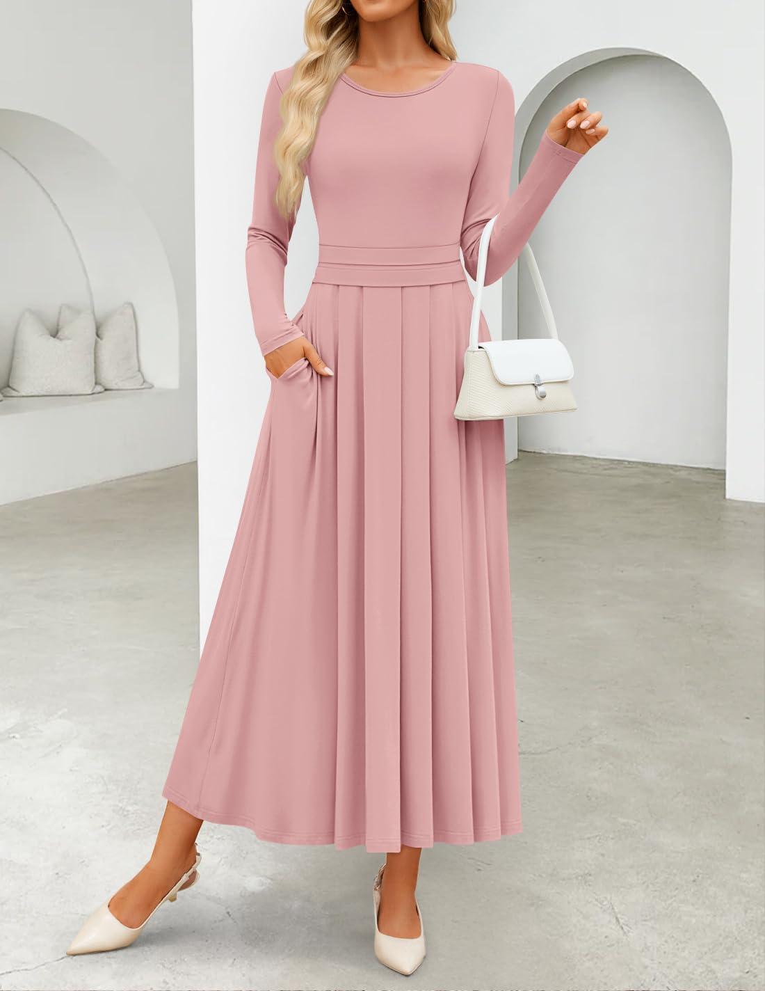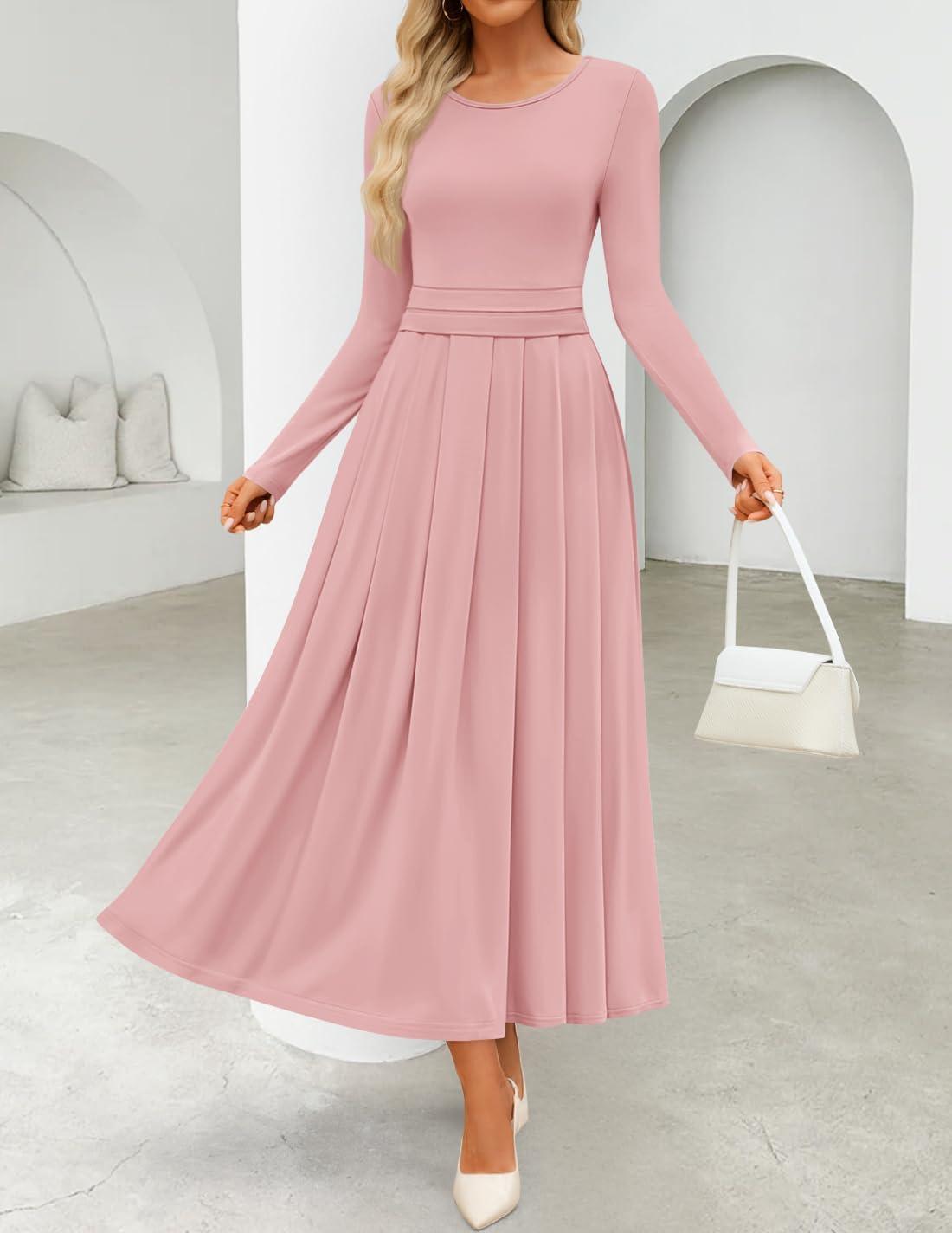 ZESICA Women’s Elegant Long Sleeve Maxi Dress 2025 Fall Crewneck Knit High Waist Pleated Flowy A Line Casual Party Dresses(Pink)
