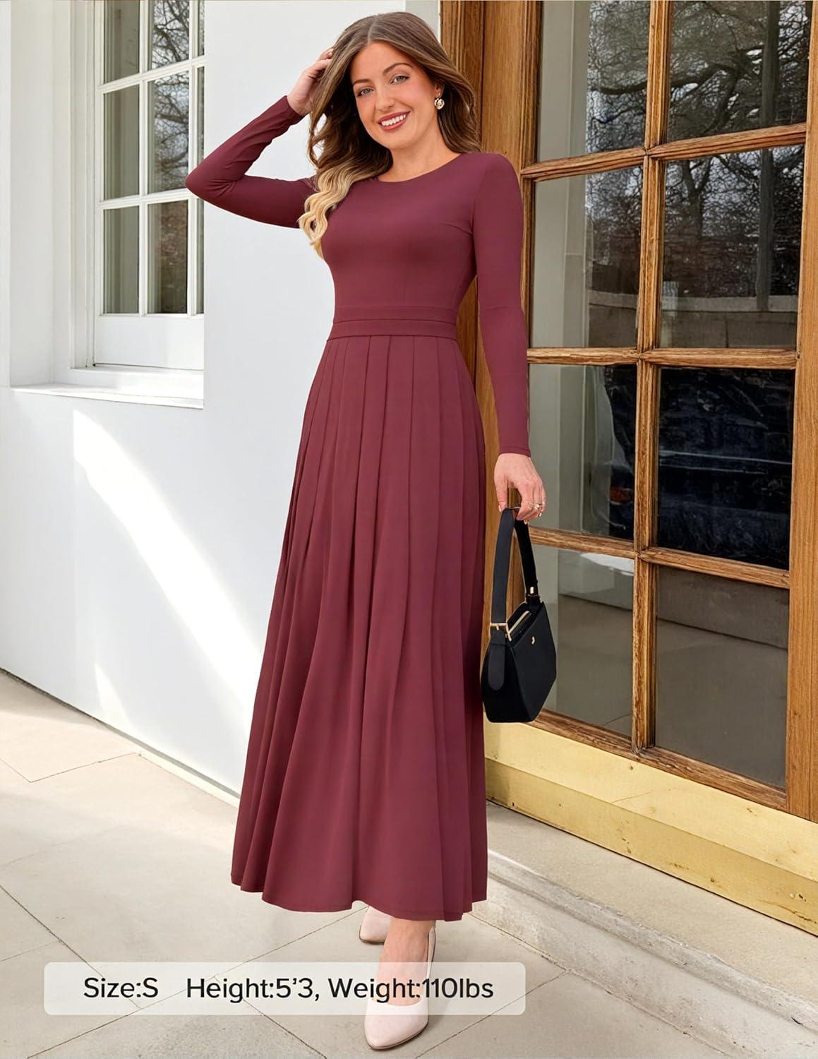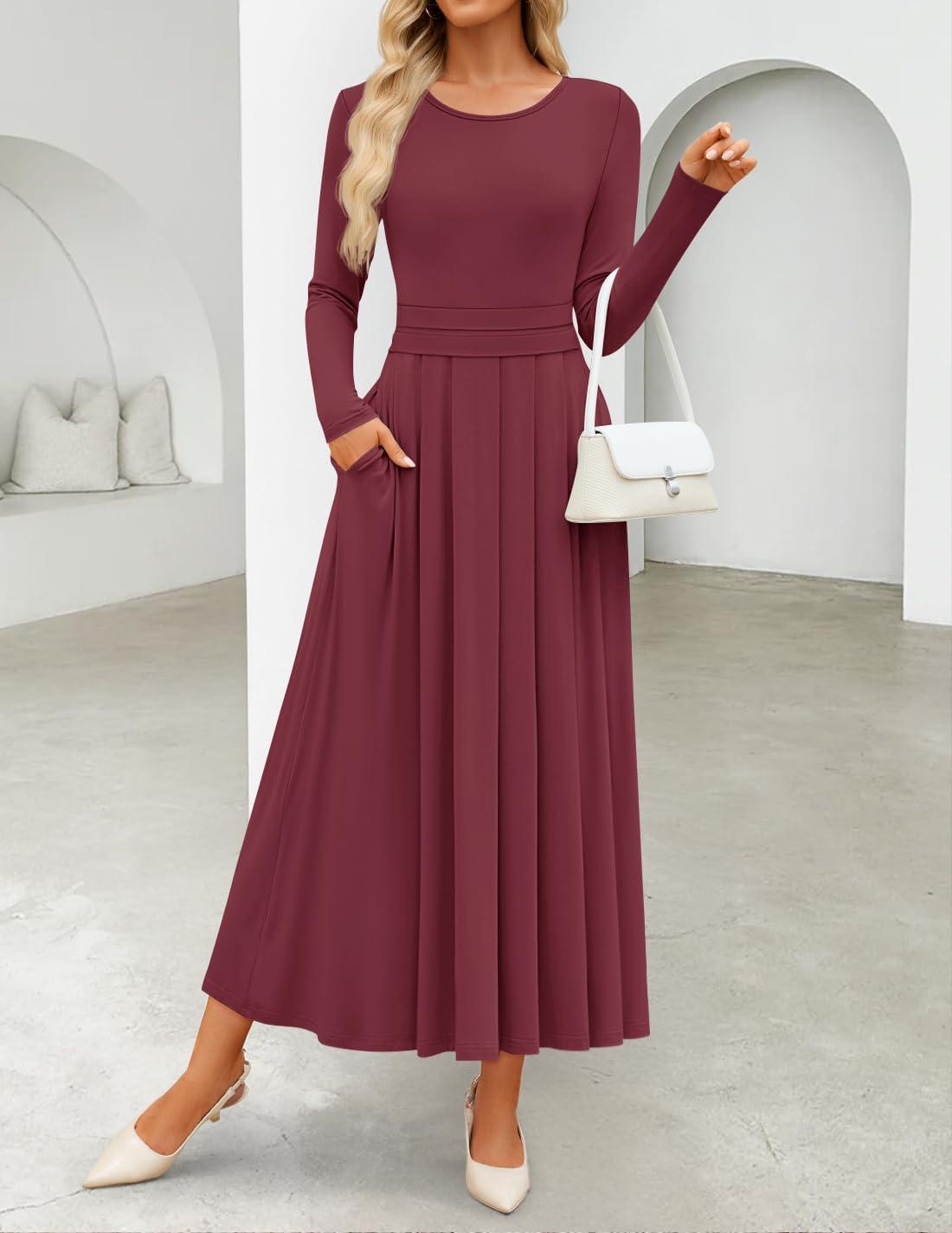 ZESICA Women’s Elegant Long Sleeve Maxi Dress 2025 Fall Crewneck Knit High Wasit Pleated Flowy A Line Casual Party Dresses(Fuchsia)