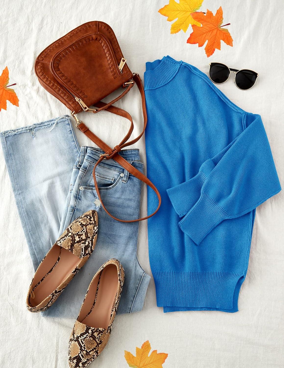 ZESICA Women’s Fall 2025 Casual Long Sleeve Crew Neck Side Slit Oversized Ribbed Knit Pullover Sweater Tops(Brightblue)