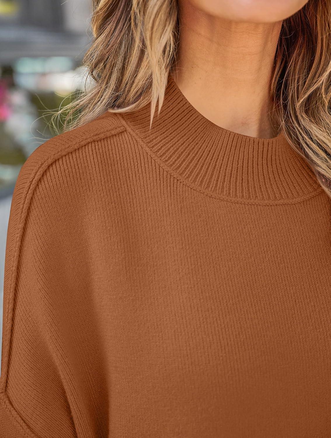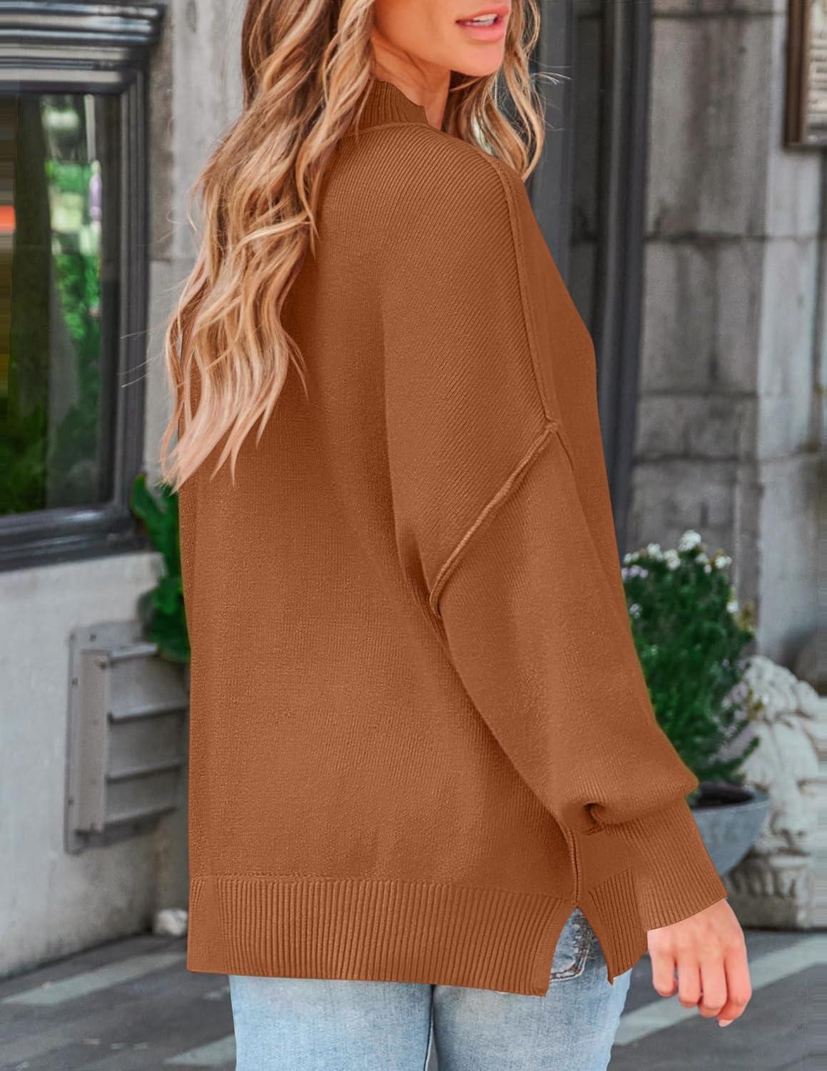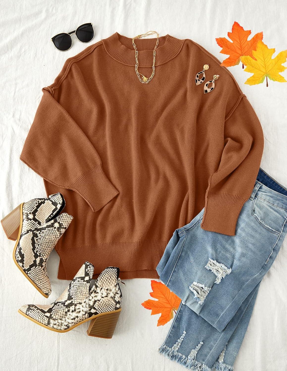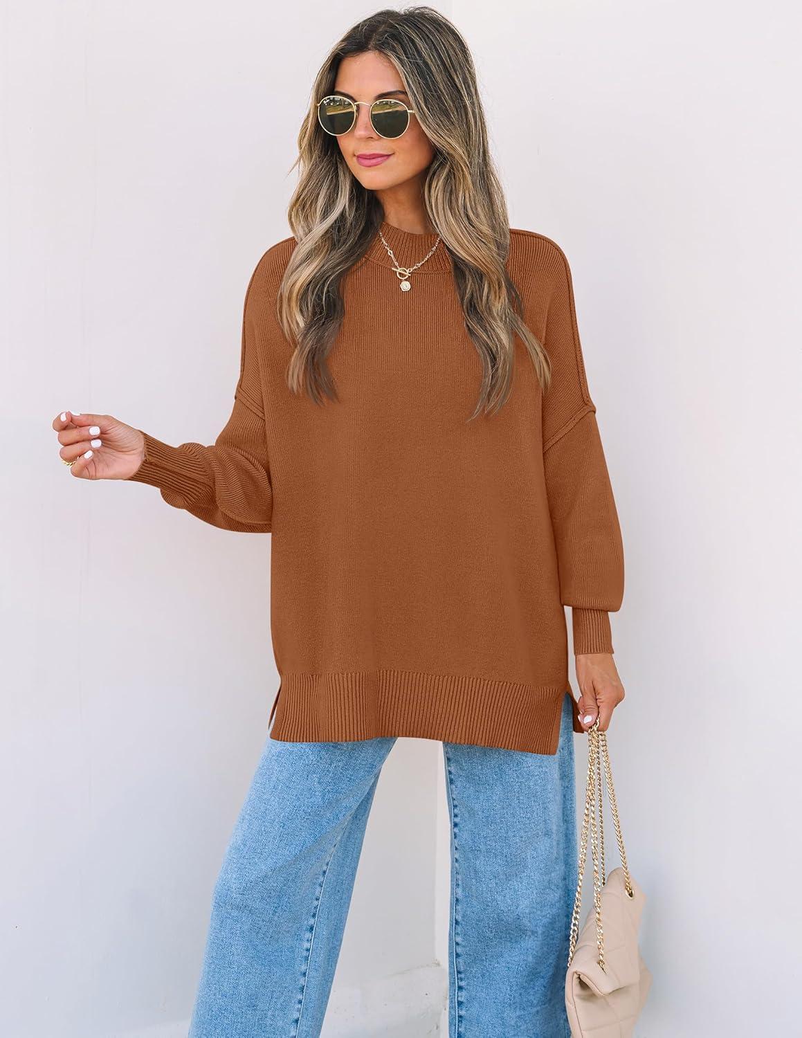 ZESICA Women’s Fall 2025 Casual Long Sleeve Crew Neck Side Slit Oversized Ribbed Knit Pullover Sweater Tops(Caramel)
