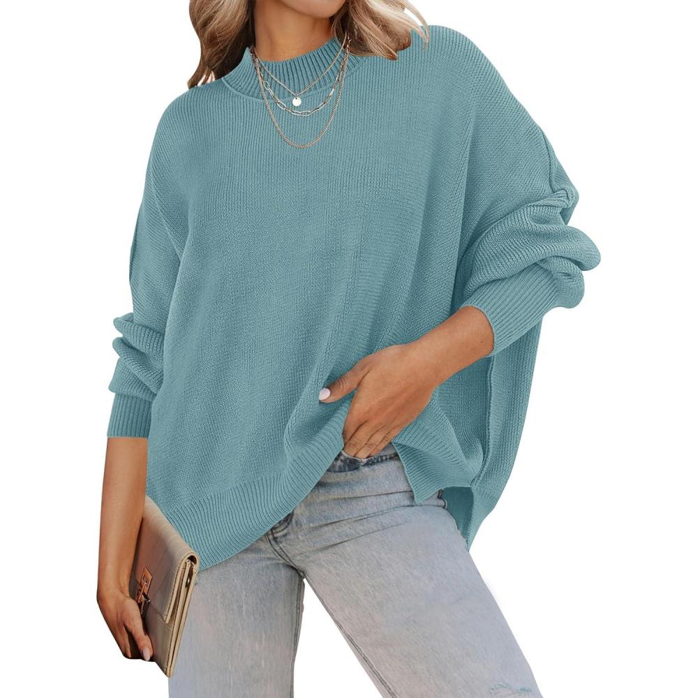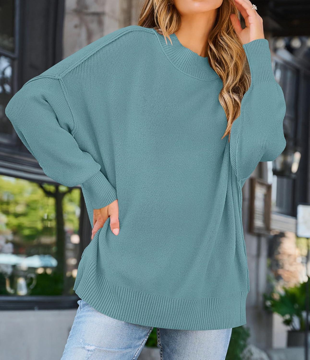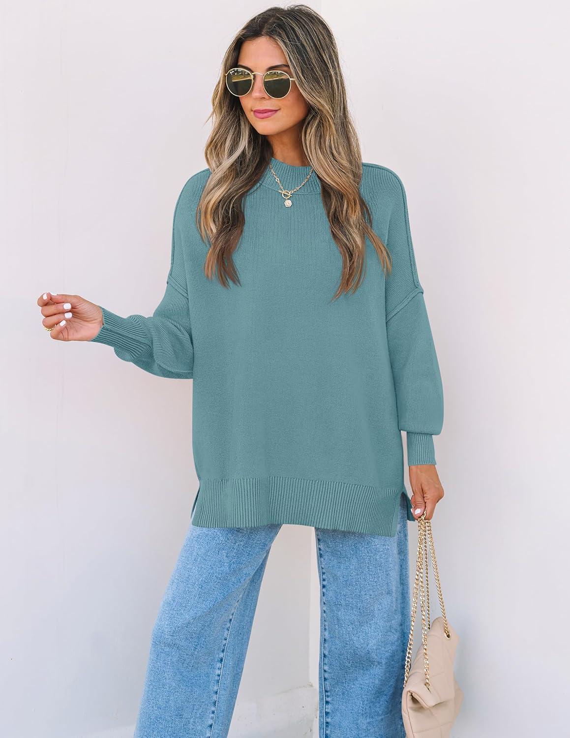 ZESICA Women’s Fall 2025 Casual Long Sleeve Crew Neck Side Slit Oversized Ribbed Knit Pullover Sweater Tops(Lake)