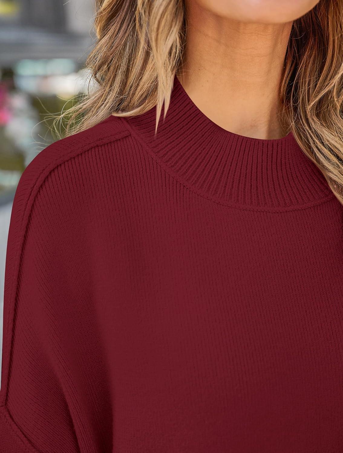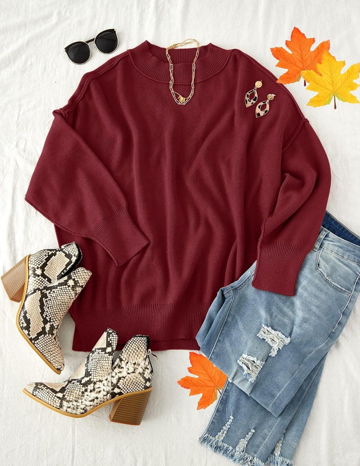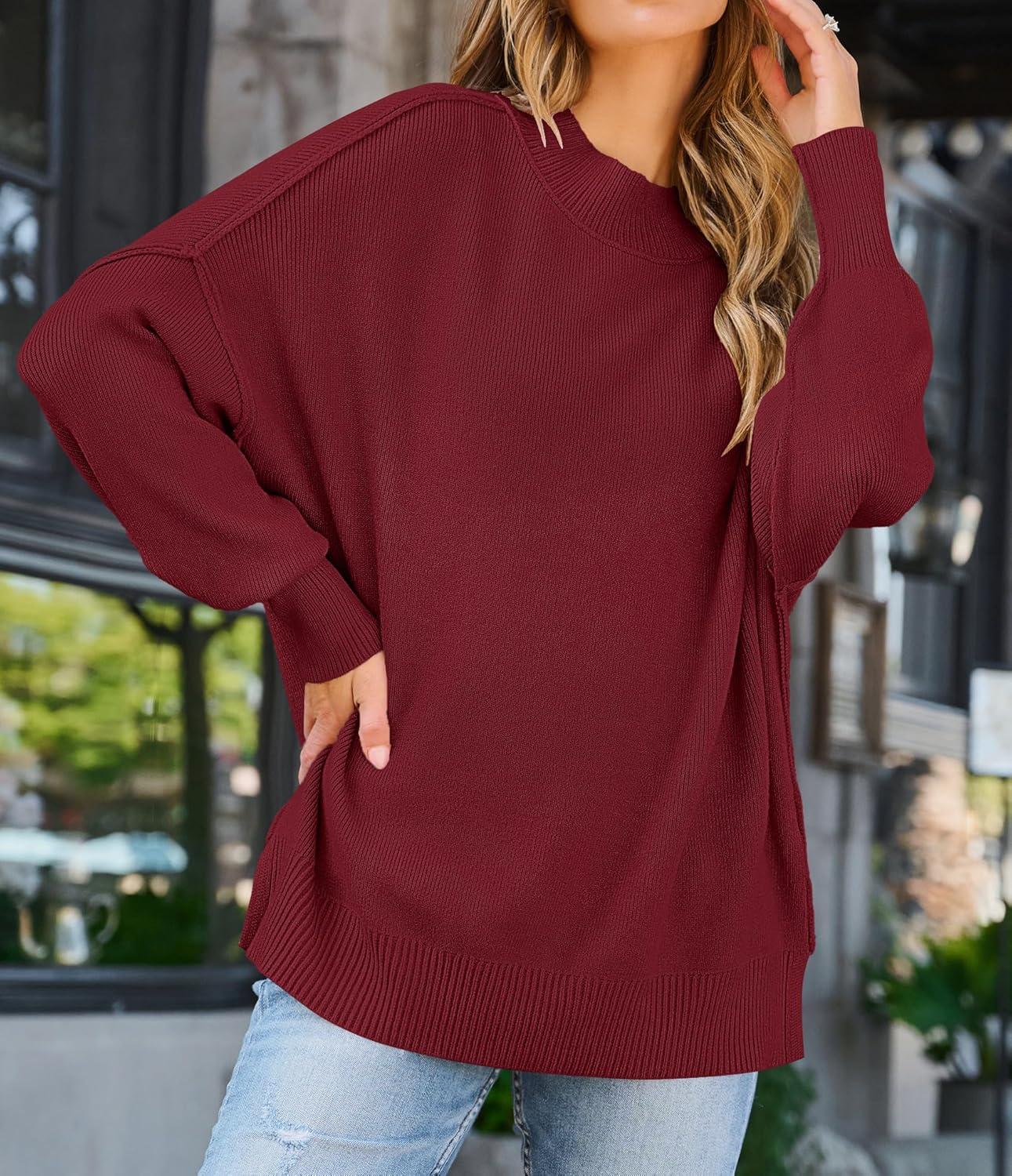 ZESICA Women’s Fall 2025 Casual Long Sleeve Crew Neck Side Slit Oversized Ribbed Knit Pullover Sweater Tops(Wine)