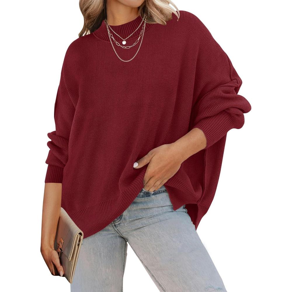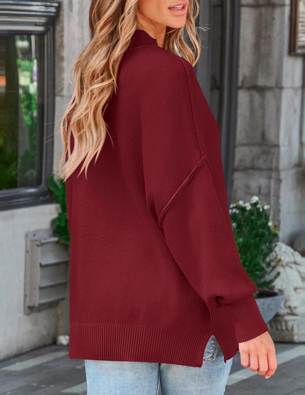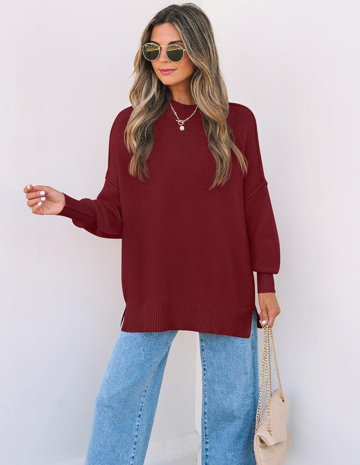 ZESICA Women's Fall 2025 Casual Long Sleeve Crew Neck Side Slit Oversized Ribbed Knit Pullover Sweater Tops(Wine)