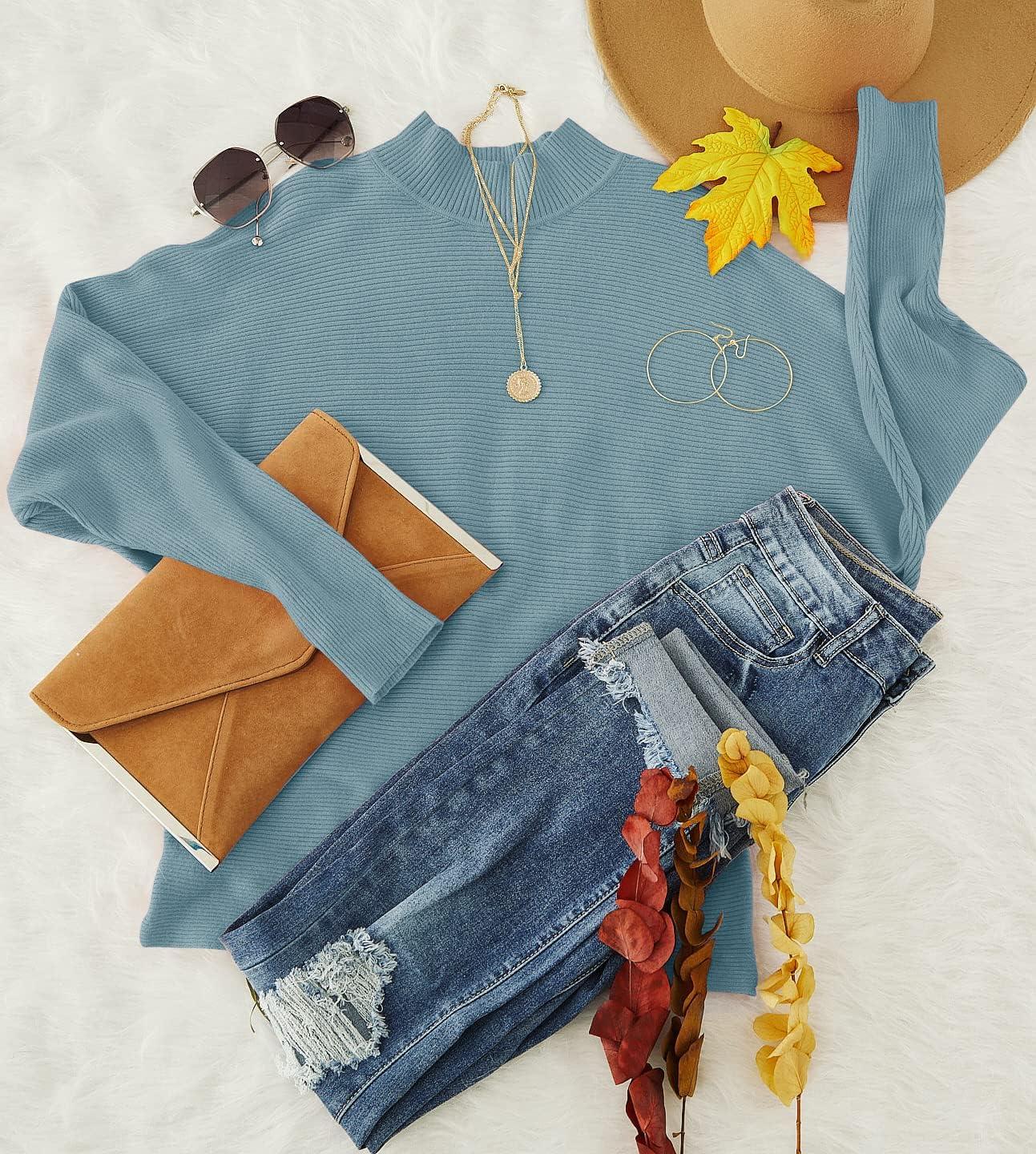 ZESICA Women’s Fall 2025 Turtleneck Batwing Long Sleeve Ribbed Knit Casual Soft Pullover Sweater Jumper Top(Blue)