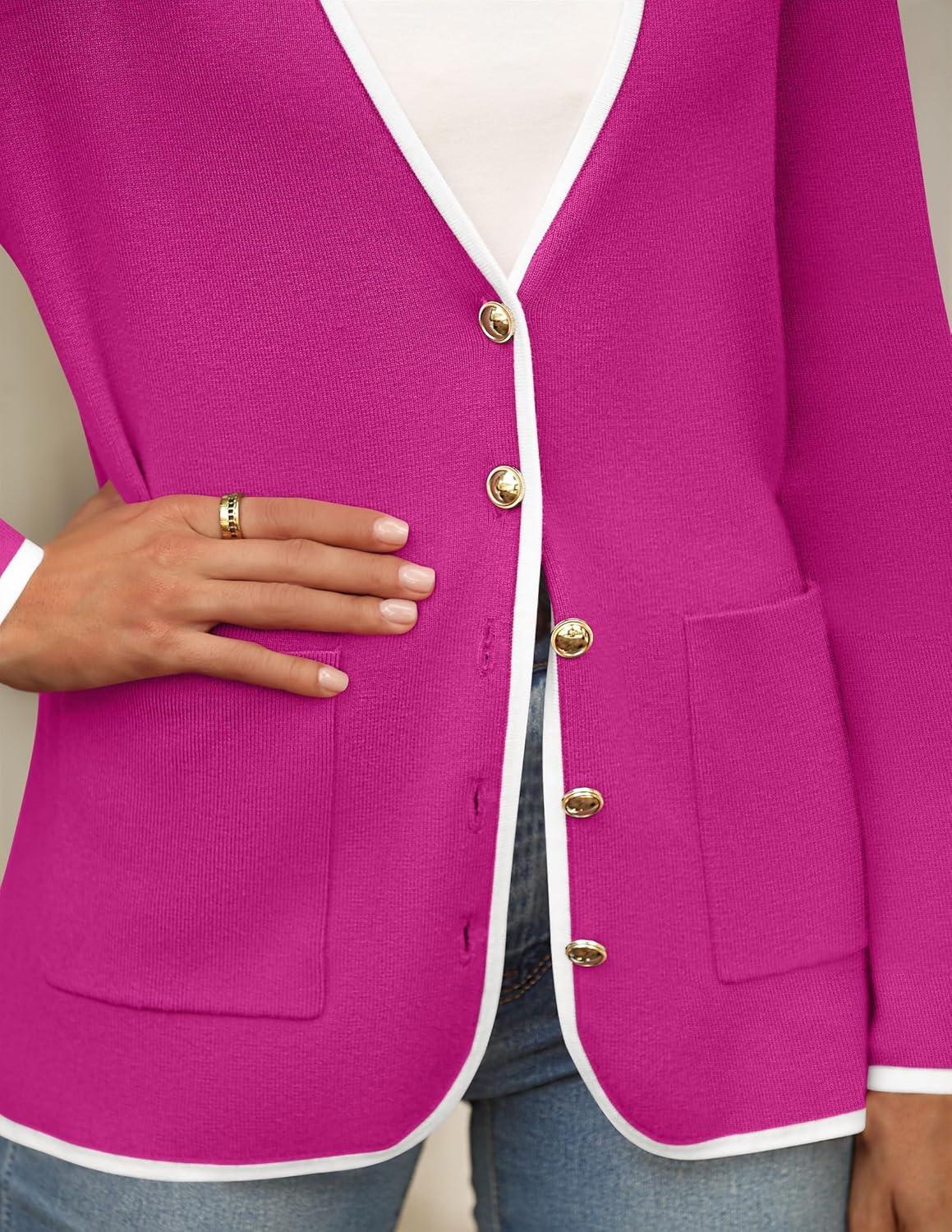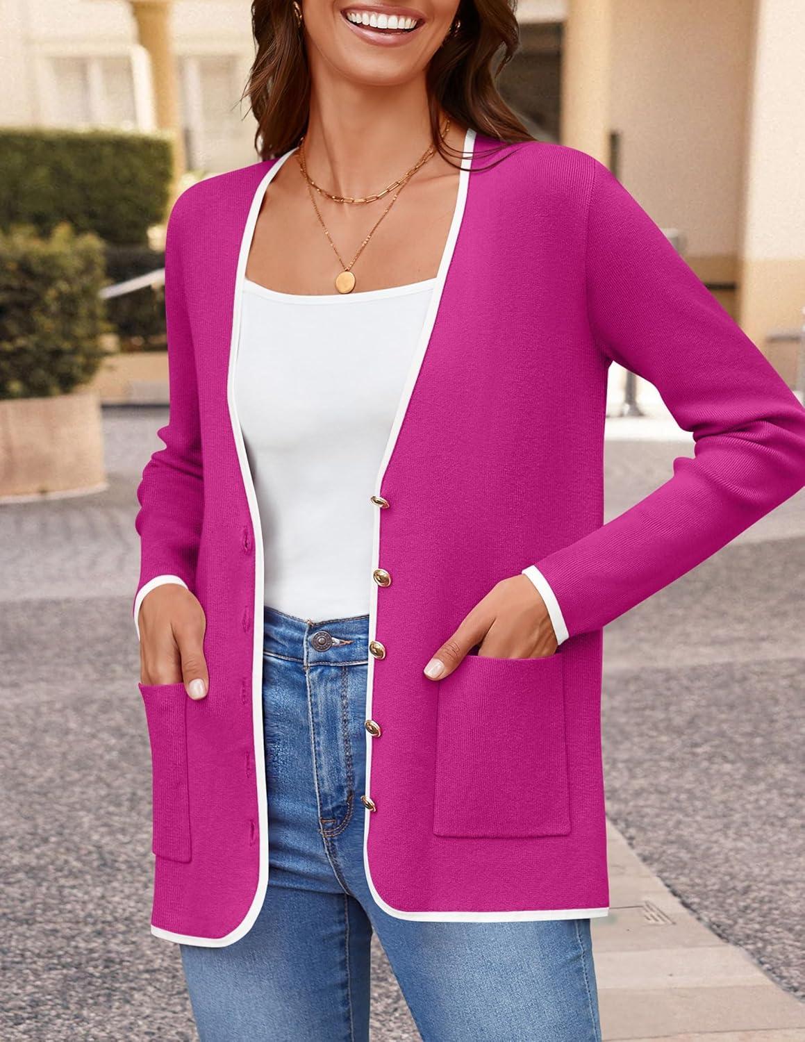 ZESICA Women’s Fall Fashion Cardigan Sweaters Long Sleeve Button Open Front Color Block Coatigan with Pockets(Rose)